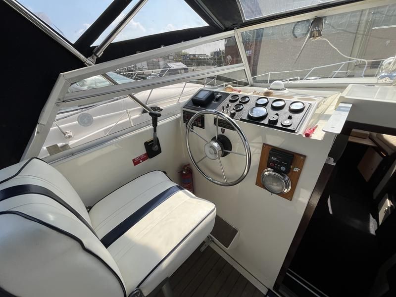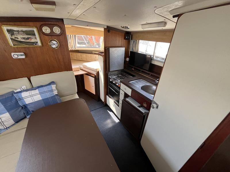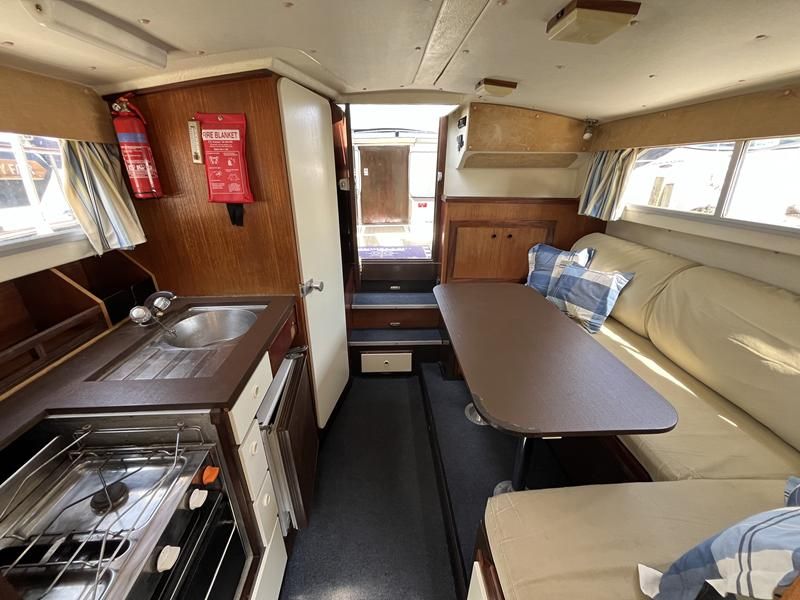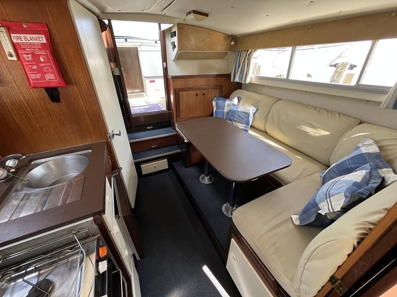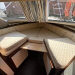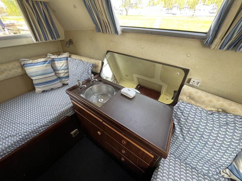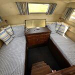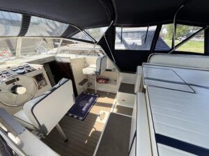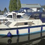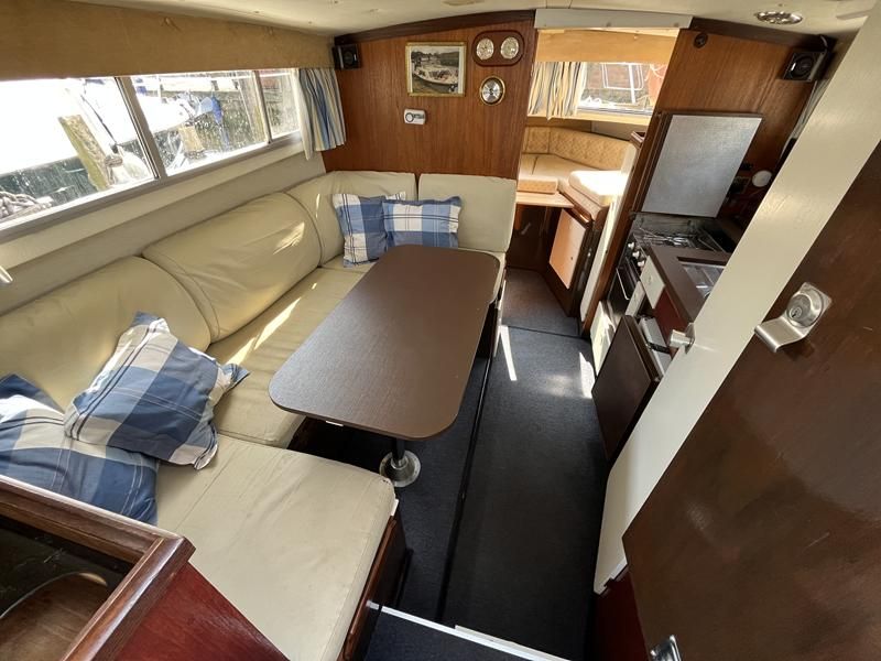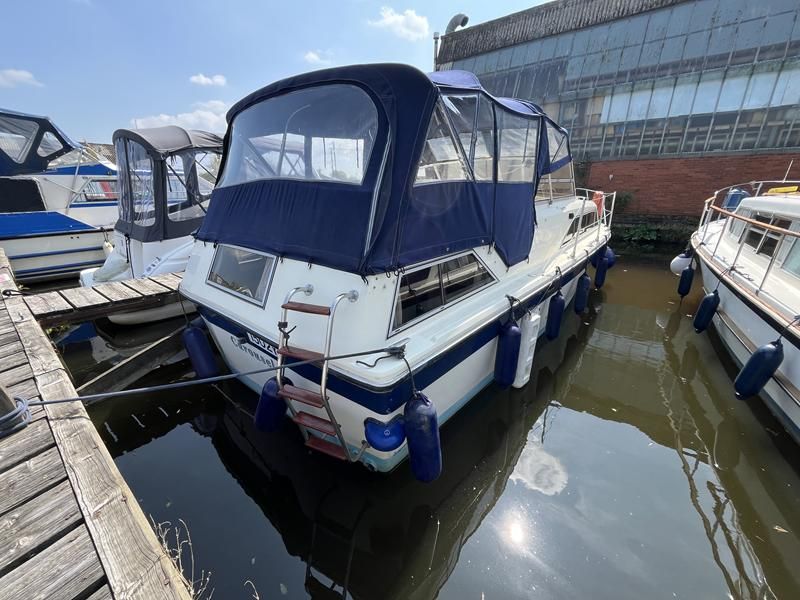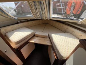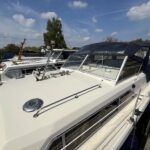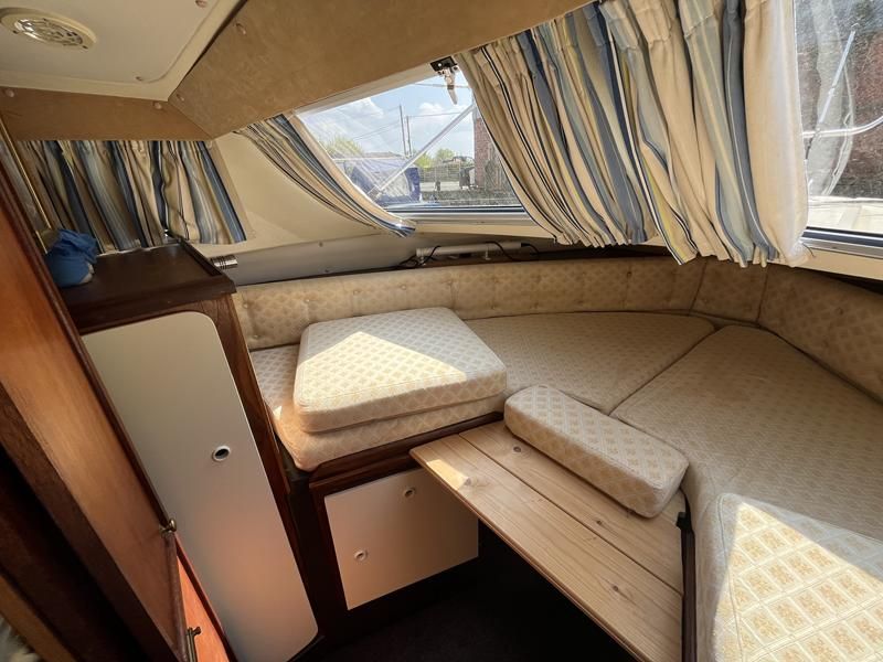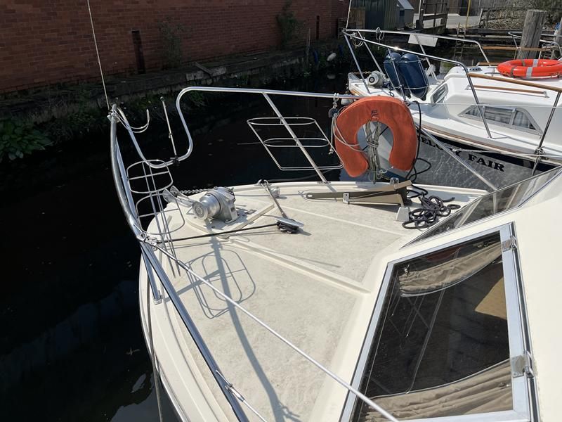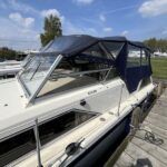 Fairline Mirage 29 Aft Cabin – Circa 1982 – Powered by a single Volvo MD31A 60hp diesel through a shaft. 6 berth accommodation across two cabins with 1 x toilet & shower. Specification including bowthruster, warm air heating, electric toilet to holding tank, shore power battery charger. BSC 03/26. Folding screens and canopy significantly reducing the air draft for increased inland access. An ideal vessel for extended inland cruising offering single diesel economy and sought after shaft configuration.