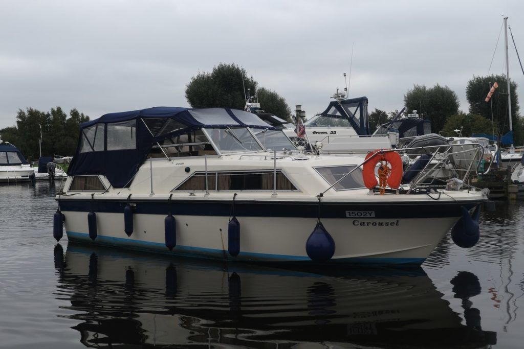 FAIRLINE MIRAGE 29 AFT CABIN – Circa. 1982 – Powered by a single Volvo MD31A 60hp diesel through a shaft. 6 berth accommodation across two cabins with toilet and shower. Specification to include; Vetus bowthruster, Eberspacher warm air heating, holding tank and shore power supply with 240v ring main and charger. Folding screens significantly reducing the air draft for increased inland access. A perfect vessel for extended inland cruising offering single diesel economy and sought after shaft configuration.