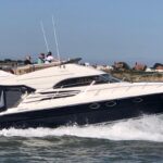 Fairline Phantom 42 – 1997 – TAMD 63 370hp Diesel Engines, 6 berth accommodation, 2 showers and toilets, generator, warm air heating, bow and stern thrusters with remote , shore power, battery charger, auto pilot, raymarine, axium 9″ plotter & 12″ plotter , trim tabs, VHF, AIS, tridata speed and depth, electric windlass, davits, hydraulic passerelle with remote, A sleek aft-cabin offshore cruiser with sizable cabin space and a sociable cockpit for entertaining.