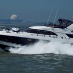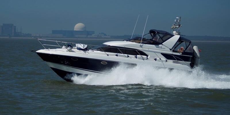 Fairline Phantom 43AC – 1997 – 2x Volvo TAMD63P 370hp diesel engines on shafts. Generous 6 berth accommodation with two toilets and showers. High specification to include; Generator, bowthruster, holding tank, trim tabs, autopilot, plotter, warm air heating, shore power, immersion, battery charger, davits and more. Folding radar arch for increased inland access, synthetic teak laid bathing platform/cockpit. BSC 2026. A sleek aft-cabin offshore cruiser with two sizable cabins and a sociable cockpit for entertaining.