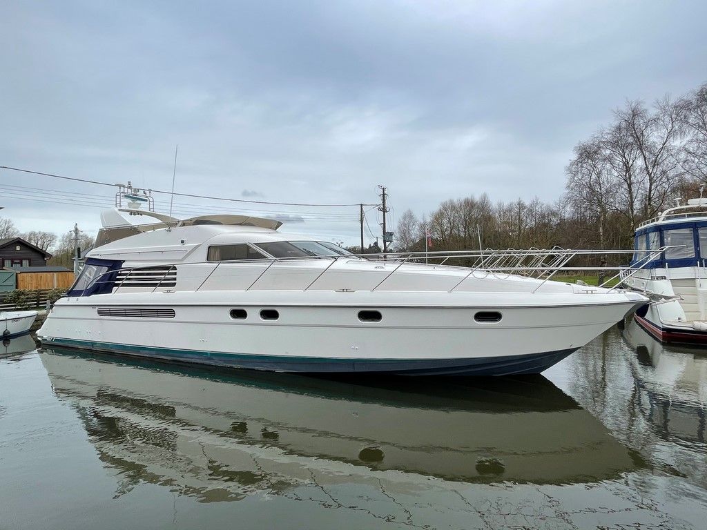 FAIRLINE SQUADRON 59 – 1996 – Powered by twin MAN 680hp diesels through shafts – 8 berth accommodation made up across 3 cabins and a crew cabin with 3 toilets and 2 showers. Very well specified to include; bowthruster, air conditioning system, 7.2kva generator, 1000w inverter, Victron battery charger, trim tabs, washer/dryer, dishwasher, electric windlass, third station throttle/thruster control to cockpit and much much more! Full synthetic teak laid cockpit, bathing platform, decks and flybridge! NYA stock fully prepared and presented to a very high standard benefitting from a recent full engine service, new carpets and linings, new flybridge upholstery, machine polish to superstructure, full mechanical inspection and PDI check. A cavernous, head turning flybridge cruiser, viewing highly recommended!