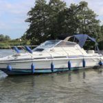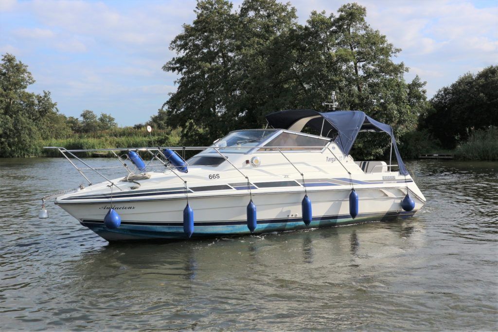 FAIRLINE TARGA 27 – 1989 – Powered by 2 x Volvo AQ205A 205hp petrol engines. 4 berth accommodation with occasional cockpit summer double berth. 1 x toilet/shower compartment with holding tank. Galley with 2 burner hob, oven, sink & fridge. Spec including shore power, battery charger, immersion heater, electric windlass, trim tabs, GPS chart plotter, speed & depth log, folding arch for improved inland access, BSC 09/21. A spacious and eye catching boat benefitting from a lower air draft.