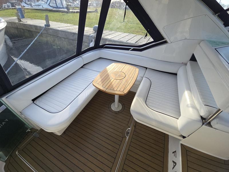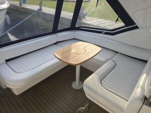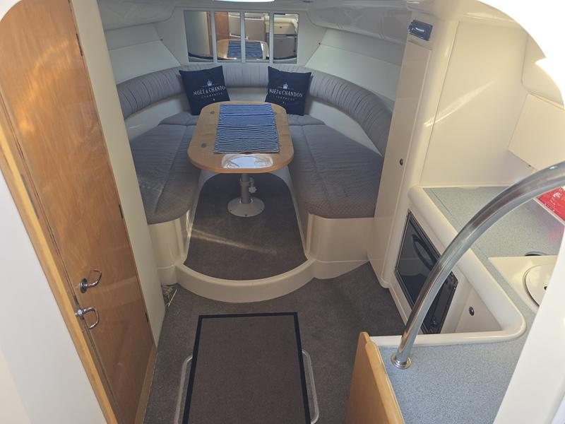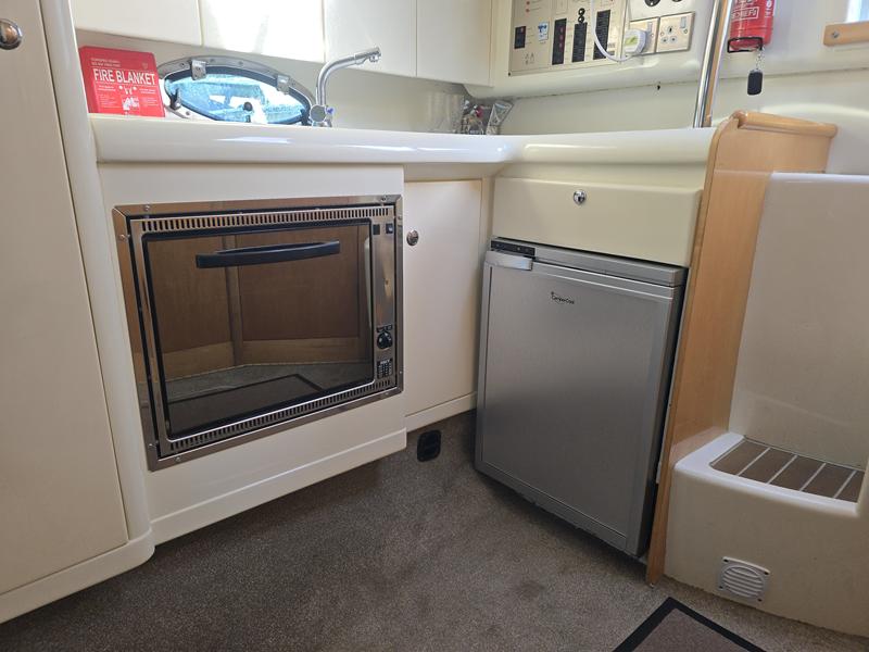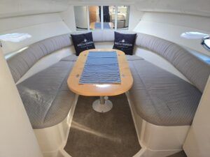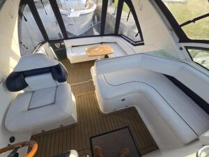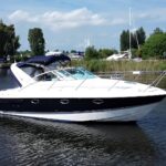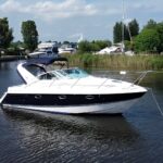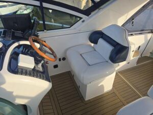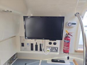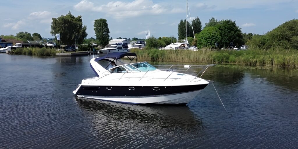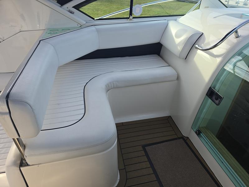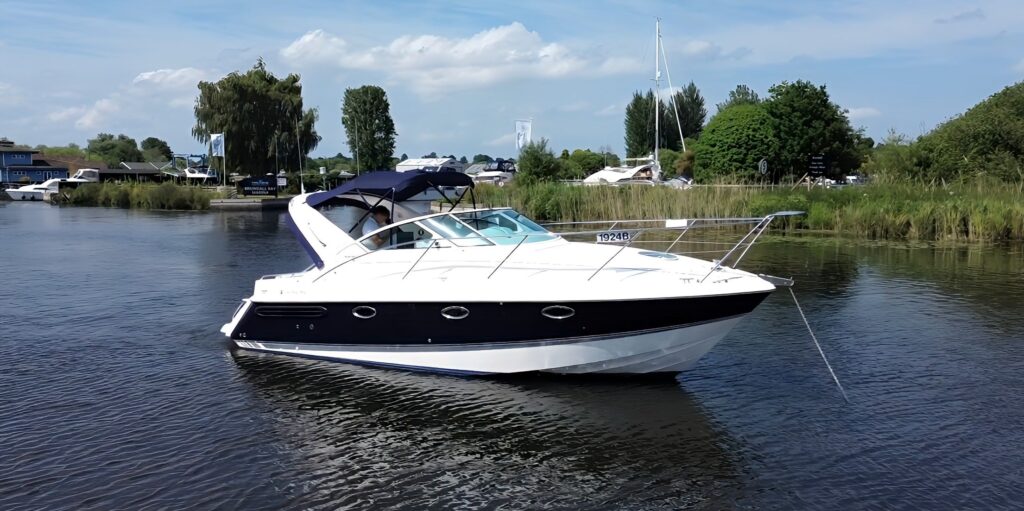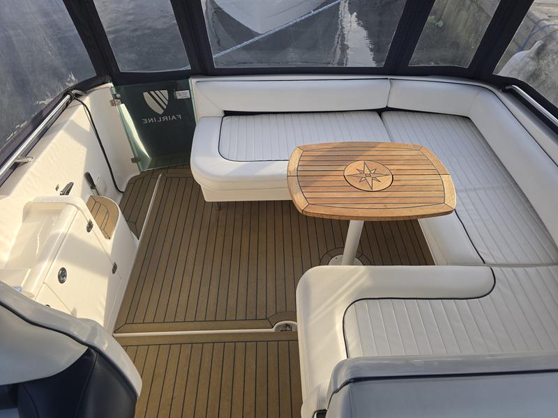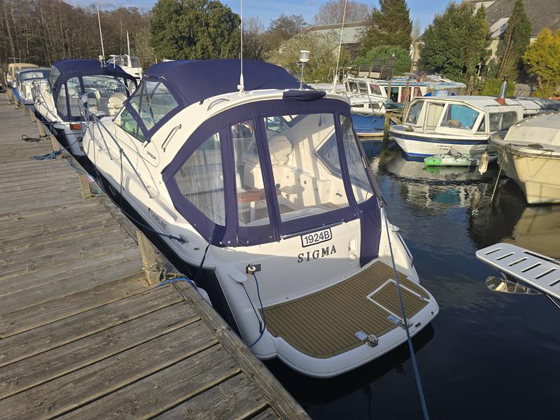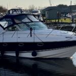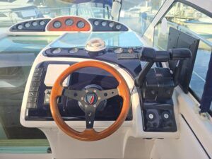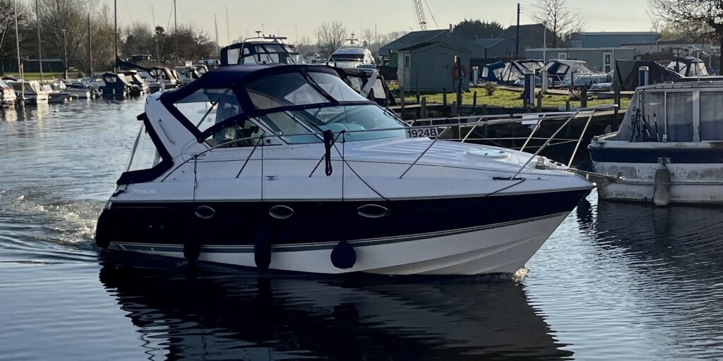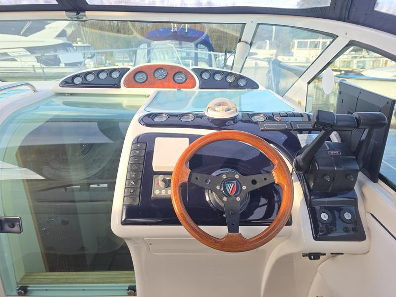 Fairline Targa 29 – 1998 – 2x Volvo Penta KAD32 170hp diesel engines. 4 berth accommodation with a separate toilet and shower compartment with an electric toilet to holding tank. Specification to include; Bow thruster, diesel warm air heating, shore power, trim tabs, power steering, windlass, snap davits, battery charger and more. Navy hull band. Engine service 2025. A striking and very capable sports cruiser in the sub-10m range, ideal as an introduction to coastal cruising.
