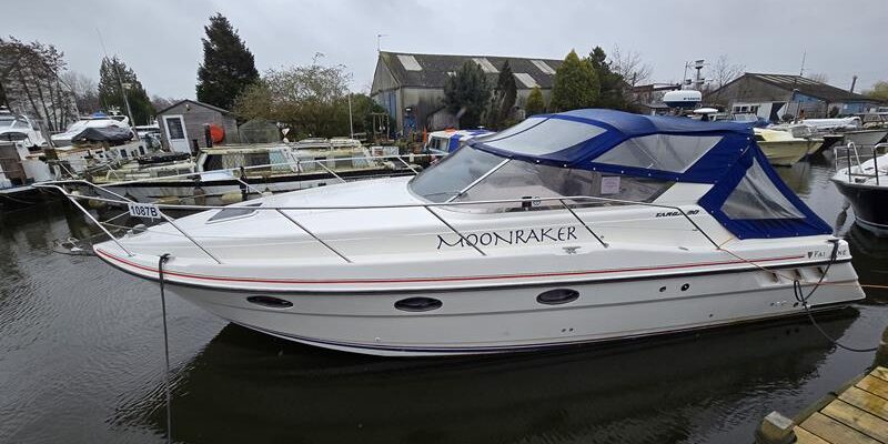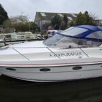 Fairline Targa 30/33 – 1991 – 2x Volvo AQAD41DP 200HP diesel engines through sterndrives. 4 berths accommodation with a toilet and shower compartment. Specification to include; Bow thruster, warm air heating system, holding tank, shore power, trim tabs, radar, electric winch, immersion heater, battery charger and synthetic teak cockpit/bathing platform. A striking sports cruiser with a sleek design, comfortable accommodations, and a sociable cockpit for entertaining.