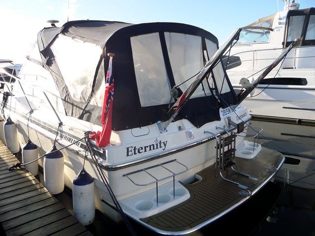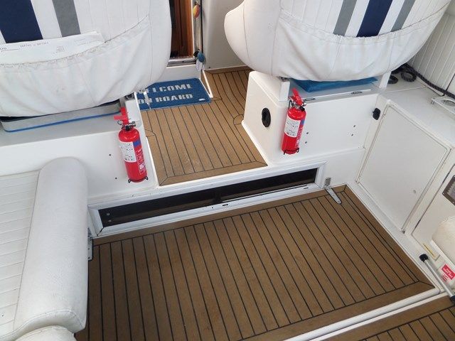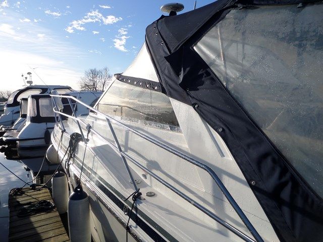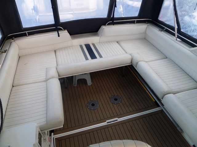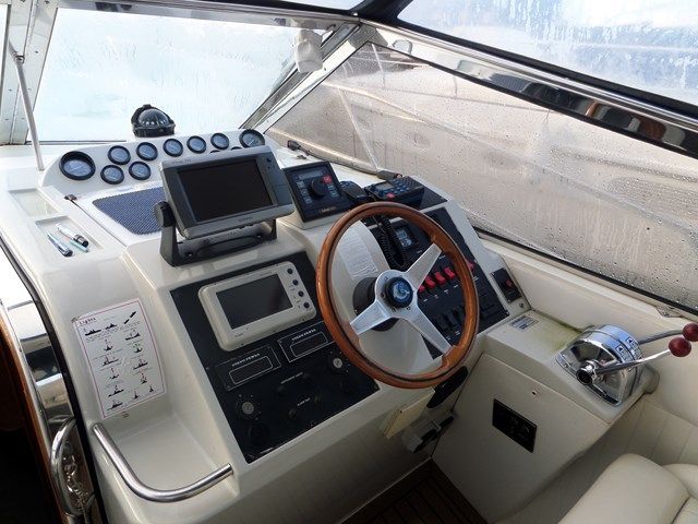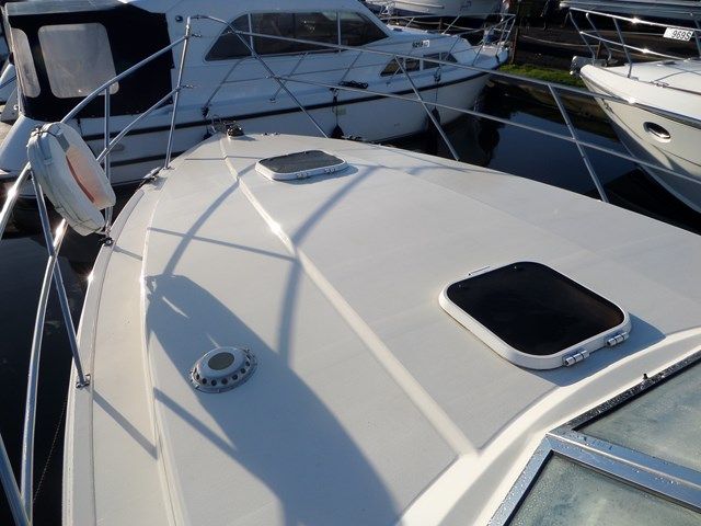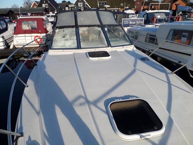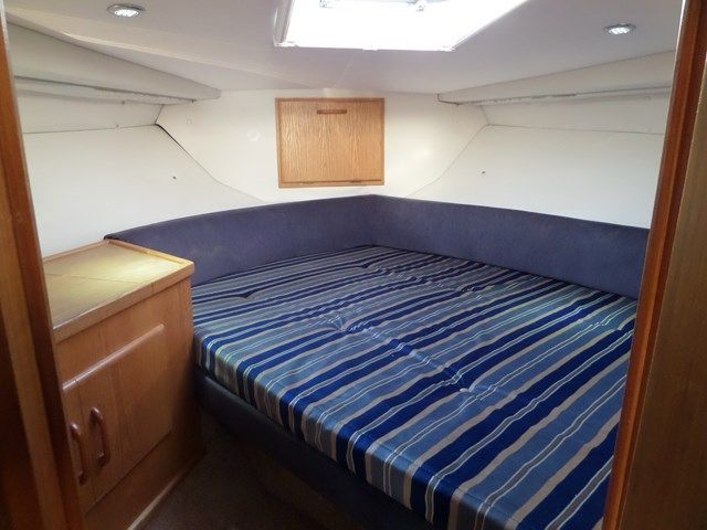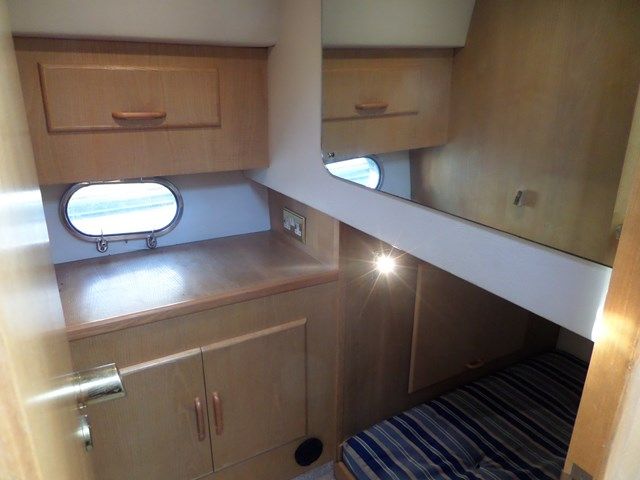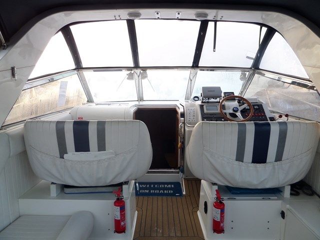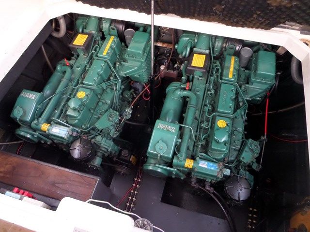 FAIRLINE TARGA 33 – 1990, 2 x Volvo 200Hp diesel engines, 4 berths in 2 cabins (plus an extra 2 in saloon), 1 x toilet & shower, Boat Safety Certificate until: 2017. Great spec: folding radar arch, hot air heating system, generator, davits, holding tank, Garmin GPS, synthetic teak cockpit & bathing platform and much more!