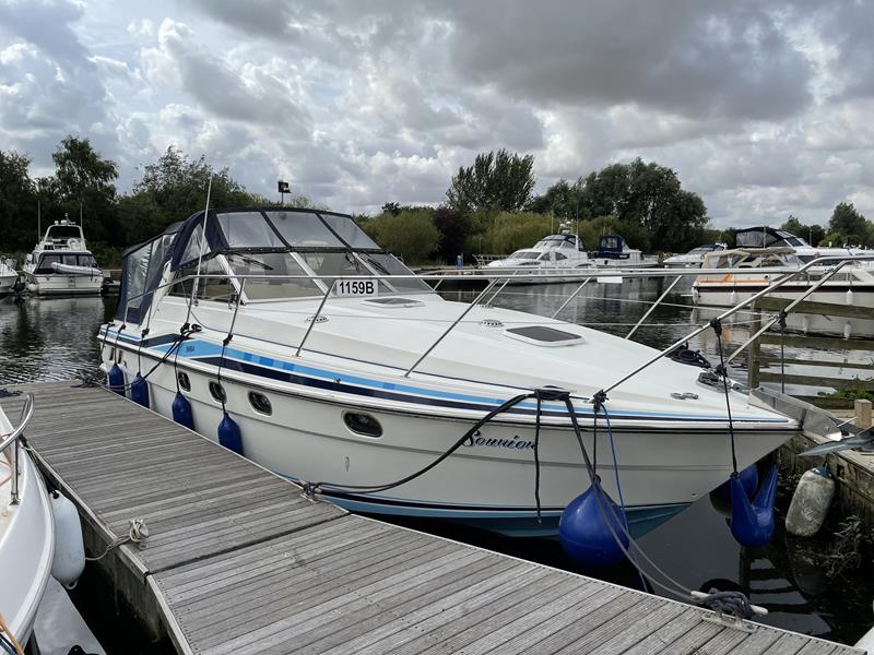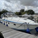 Fairline Targa 33 – 1988 – Powered by 2 x Volvo AQ171C 170hp petrol engines through sterndrives. Up to 6 berth accommodation over two cabins and saloon with 1 x toilet/shower compartment. Galley with 2 burner gas hob, oven, grill, fridge and sink. Specification including Bow thruster, shore power, electric windlass, immersion heater, electric toilet, synthetic teak decking to bathing platform & cockpit, VHF, BSC 03/23. A well presented & popular sports cruiser offering spacious accommodation and a social cockpit space for entertaining.