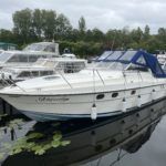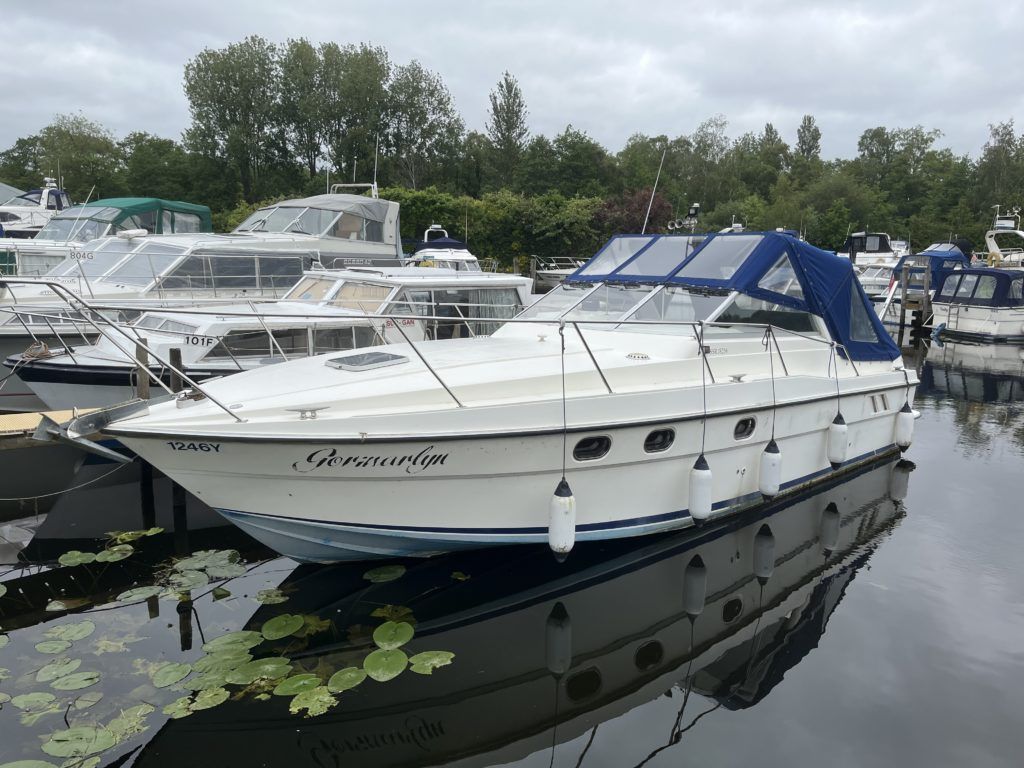 FAIRLINE TARGA 33 – 1986 – 2 x BMW D636 180hp diesel engines through sterndrives. 6 berth accommodation over two cabins and a saloon with a sea toilet/shower compartment. Specification to include; Shore power, immersion heater, battery charger, Bennett trim tabs, Lawrence elite 7 chart plotter, Lofrans electric winch, Icom VHF, Clipper depth/speed, bathing platform, BSC 09/25 & Broads toll paid 2023 / 2024 . Galley with 2 burner gas hob, oven, grill, fridge and sink. A stylish and highly sought-after sports cruiser that provides ample living space and a sociable cockpit area for hosting family and friends.