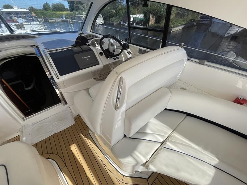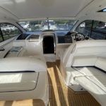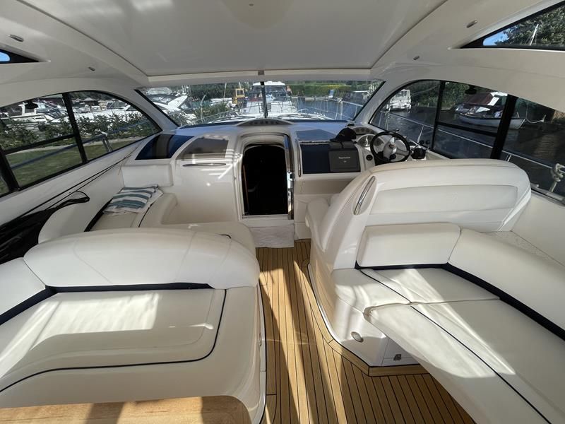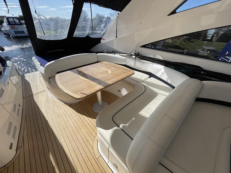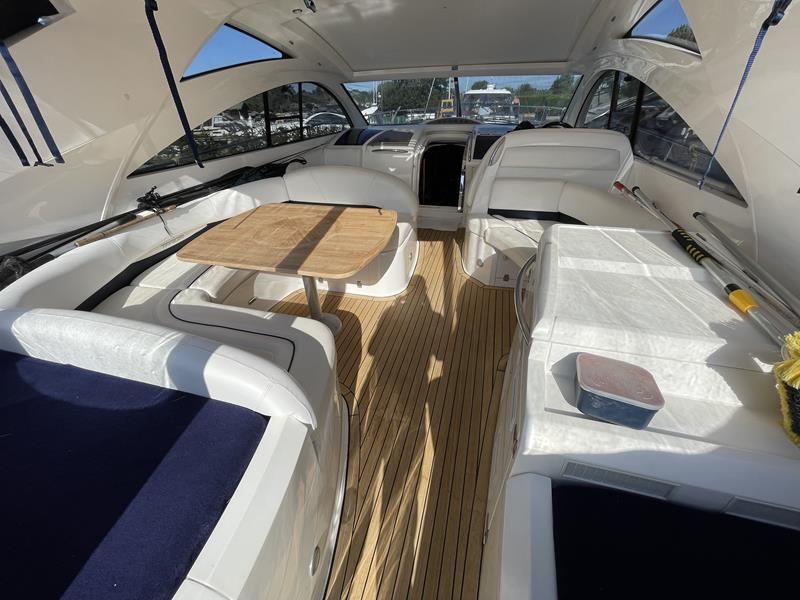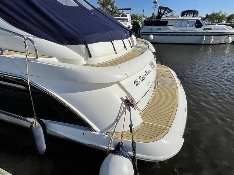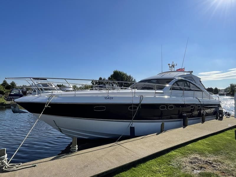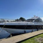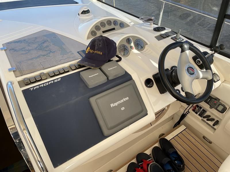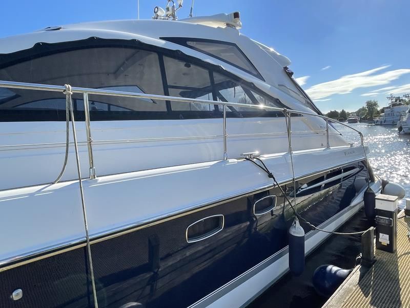 FAIRLINE TARGA 52 GT – 2007 – Powered by twin Volvo D12-800 diesels through shafts – 6 berth accommodation across 3 cabins with two toilets and two showers – Specification to include; 13kva generator, reverse cycle air conditioning, bowthruster, Raymarine plotter and autopilot, electric windlass, 1600w inverter, trim tabs. Full teak laid cockpit, bathing platform and decks with striking blue hull. Electric sliding cockpit roof and cockpit wet bar with BBQ, refrigerator and ice maker! A cavernous sports cruising with a large specification to match. Masses of style and performance, a real head turner!