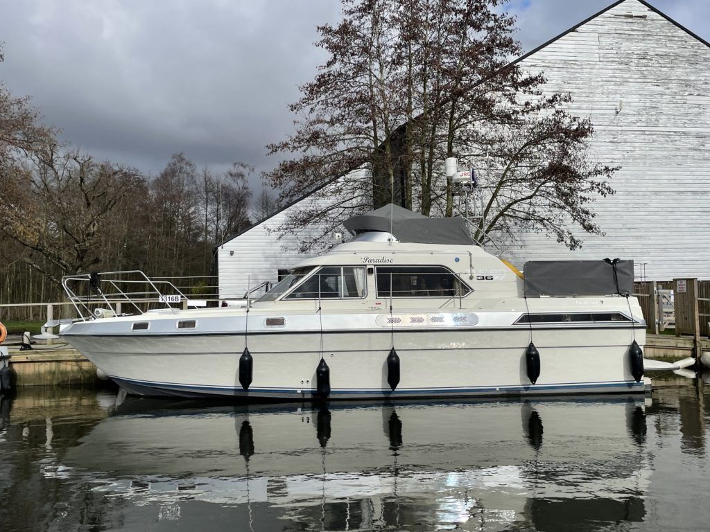 FAIRLINE TURBO 36 – 1985 – Powered by twin Volvo TAMD60C 255hp diesels through shafts – 6 berth accommodation with 2 toilets and 2 showers – Specification to include; Shore power supply with immersion, 240v sockets and charger, bow thruster, electric windlass, Garmin GPS, trim tabs, oven, hob , grill and refrigerator. Engines serviced 2021, antifoul and and hull polish 2021. New charger, calorifier, flybridge cover and flybridge upholstery in current ownership. BSC 07/2025. The ever popular Turbo 36 from Fairline, a perfect introduction into family offshore cruising!
