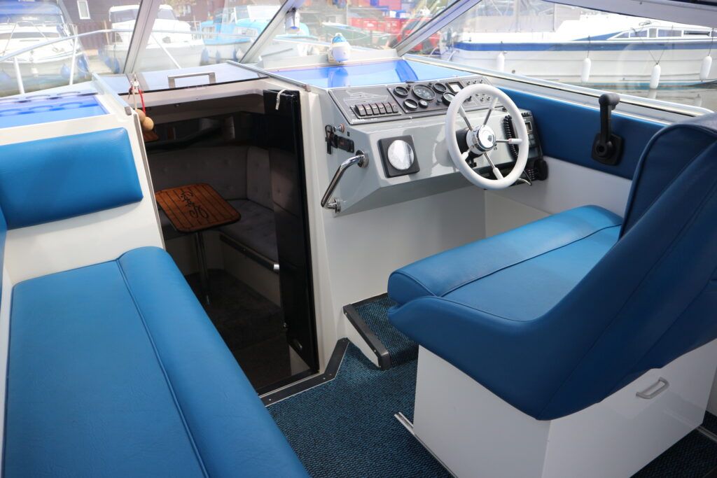 Falcon 22 – 1989 – Single Volvo Penta AQ151 146hp petrol engine with a sterndrive. 4 berth accommodation with a single toilet compartment. Specification to include; 2 burner gas hob and grill, fridge, VHF radio, speed and depth logs, electric windlass. “Sibby” is an attractive, Norfolk built sports boats, offering good accommodation for her size. A good starter boats, ideal for inland and coastal cruising.