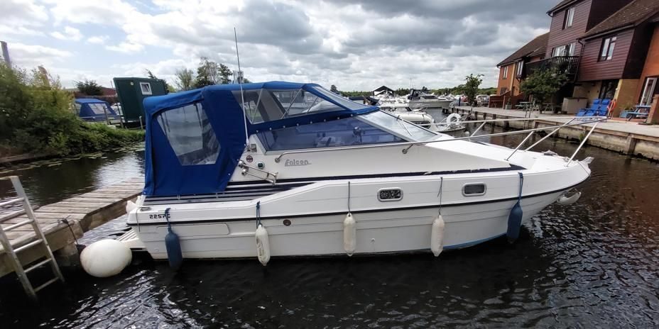 Falcon 22 SPC – Circa 1991 – Single Mercruiser D183 150HP diesel engine. 4 berth accommodation with a separate toilet and shower compartment. Specification to include: Trim tabs, Mikuni gas heating system, calorifier, 2 burner hob and grill, Engel refrigerator. New canopy 2023. A rare original diesel example of these ever popular family sports cruisers. More pictures to follow.