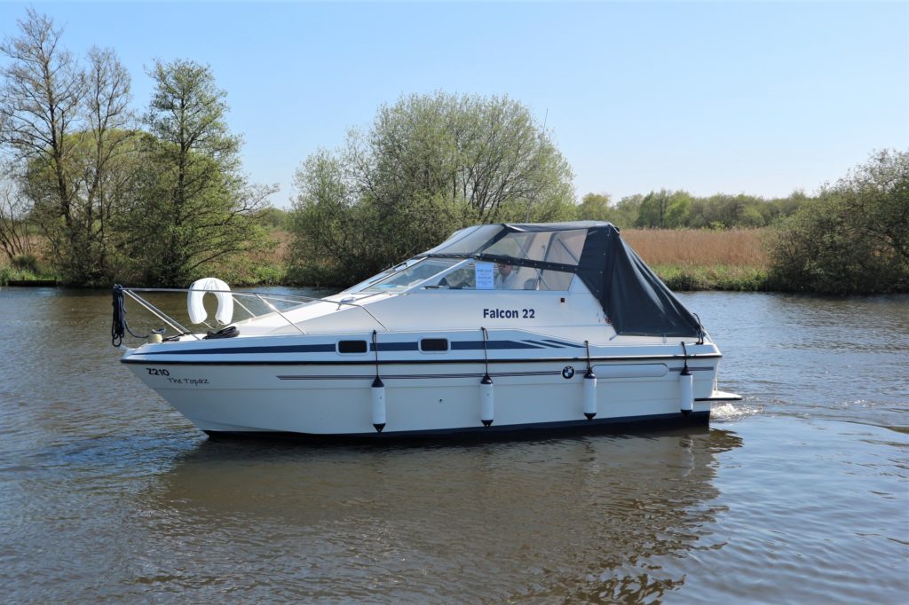 FALCON 22 – 1984 – 1 x BMW 220 (190hp) Petrol Engine. Up to 4 berth accommodation with 1 x toilet (to holding tank)/shower compartment. Spec including shore power, VHF, Garmin GPS 152, speed & depth log, gas cabin heater, BSC 06/21. A great sporty introduction to boating with the benefit of being recently polished, antifouled & engine and drive serviced in 04/18.