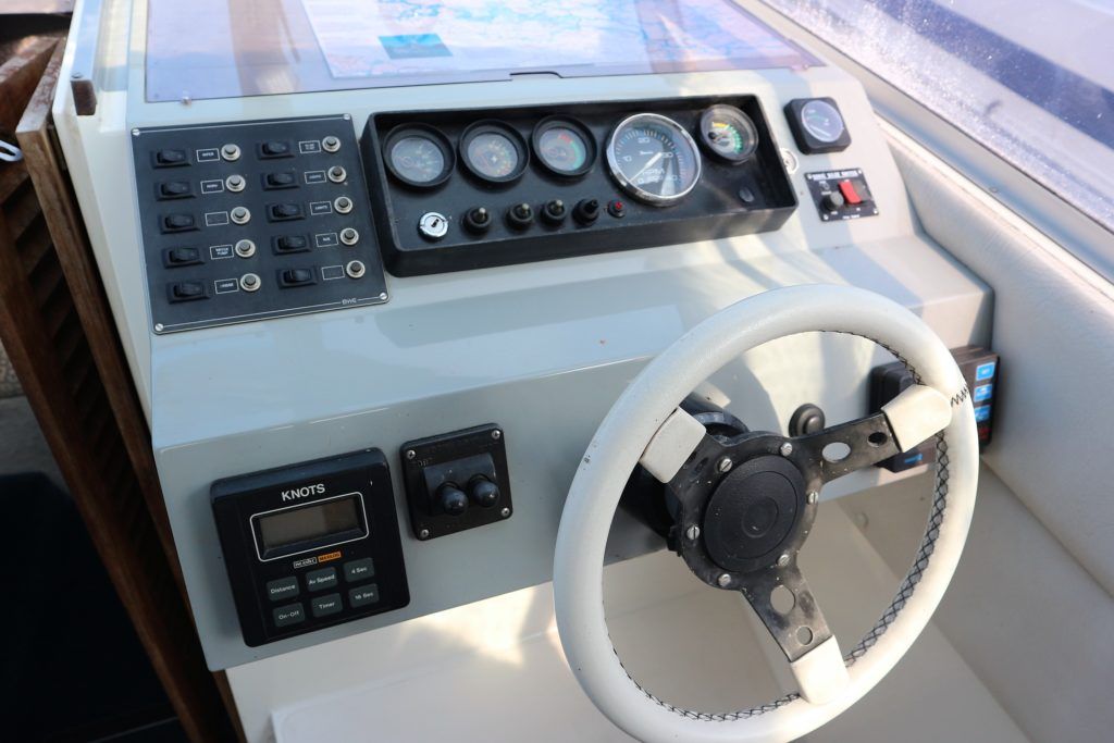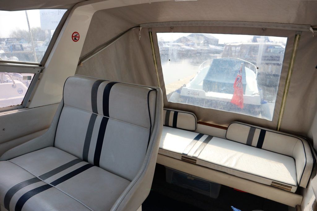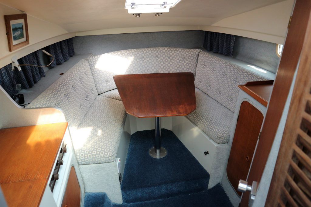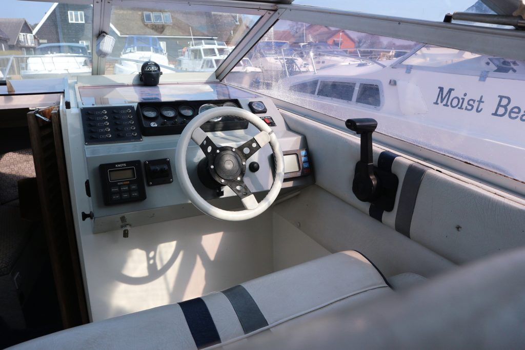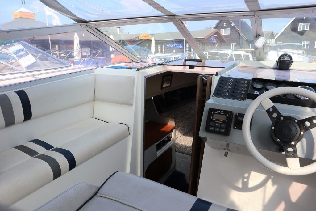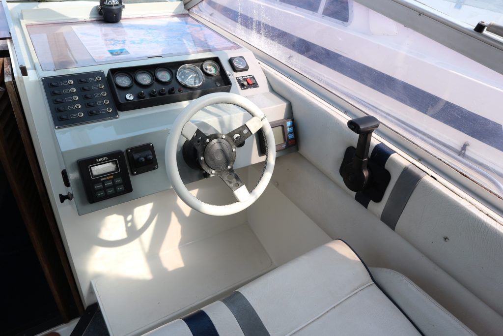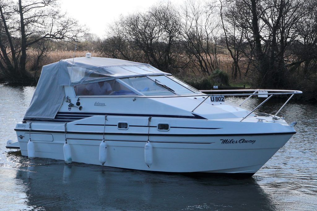 FALCON 22 – 1989 – Single Ford 75hp diesel engine. 4 berth accommodation with 1 x toilet and shower compartment. Galley with two burner hob and grill, hot water supply, fridge in cockpit, warm air heating to cabin & cockpit, shore power, battery charger, BSC 24/04/20. A popular sports style cruiser offering the practicality of a diesel engine.