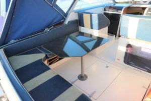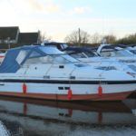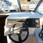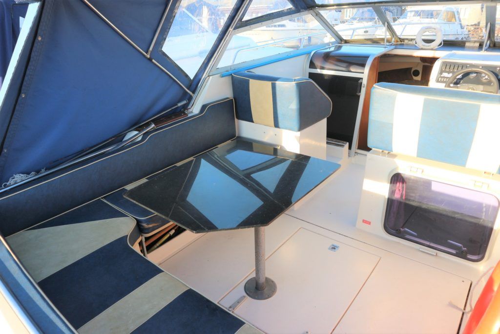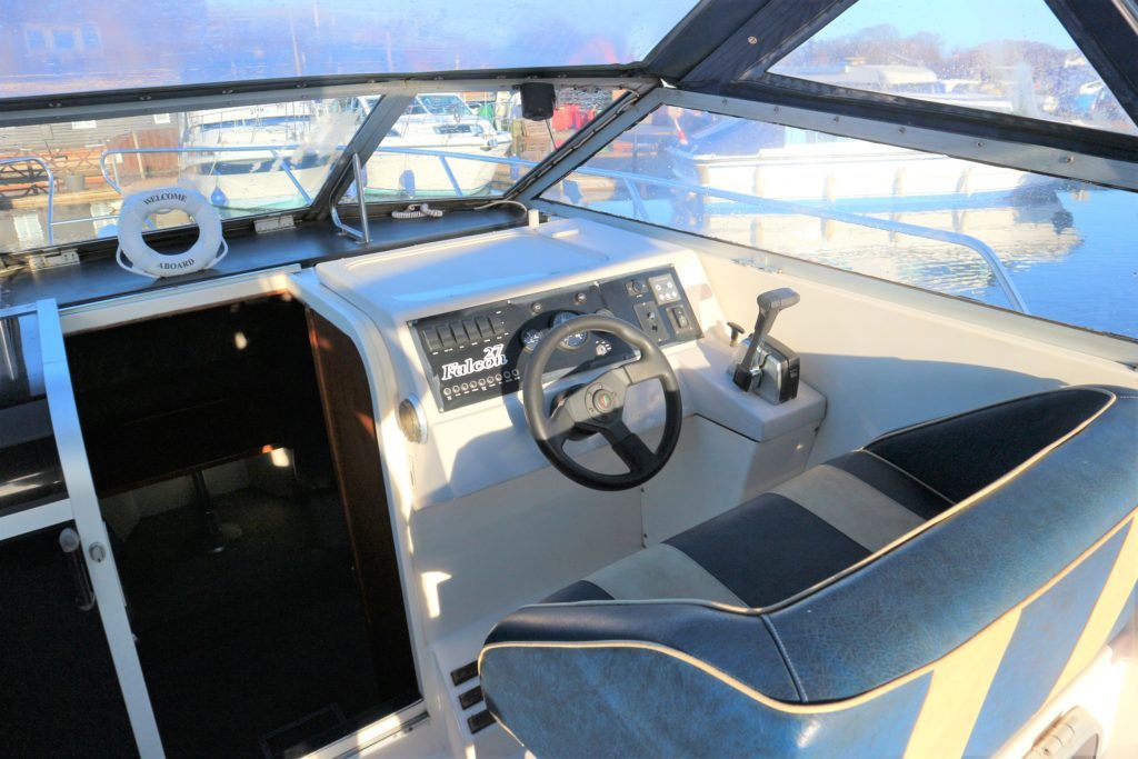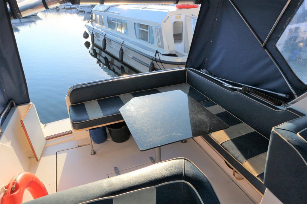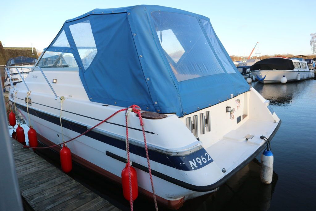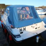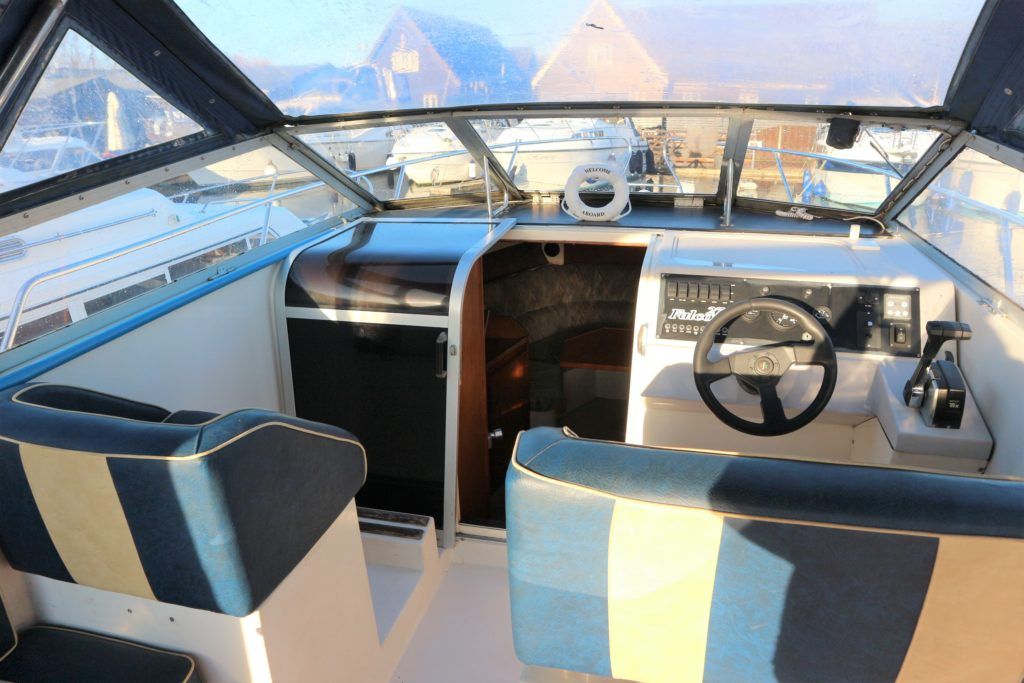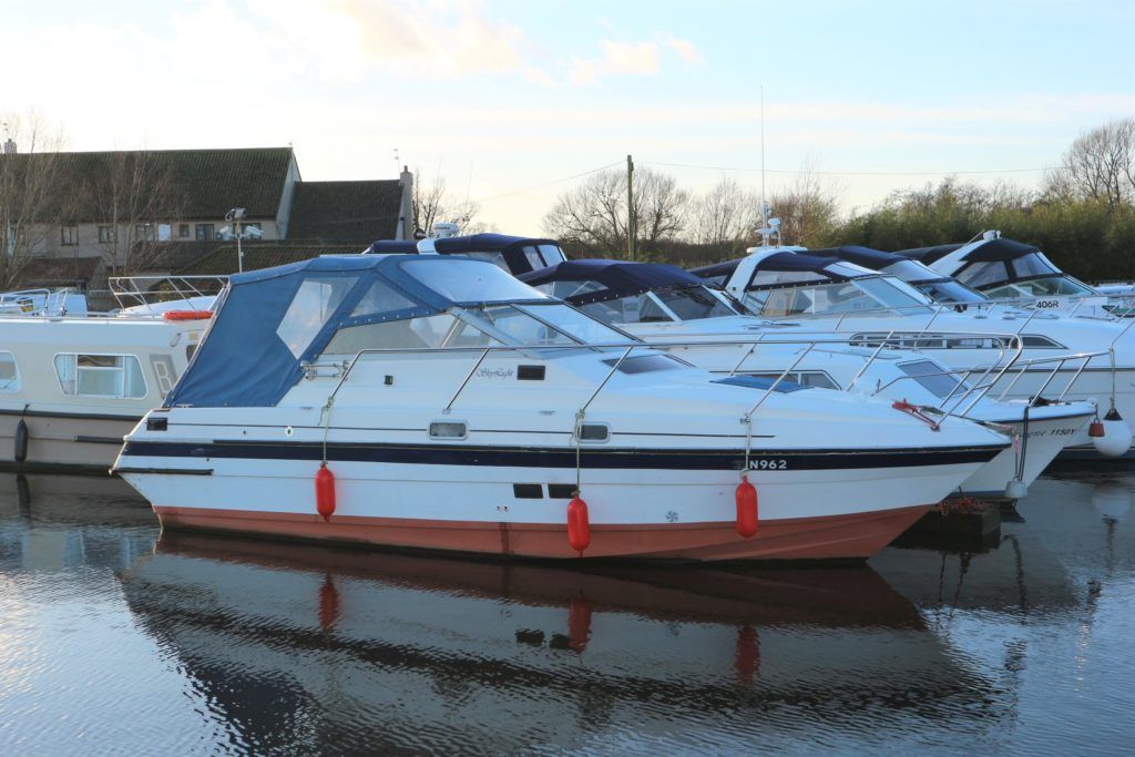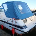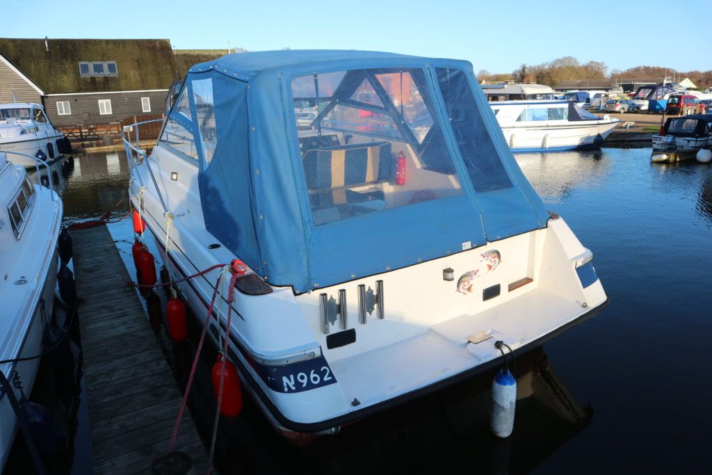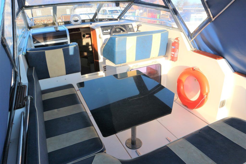 FALCON 27 – 1991 – Single Perkins 3 cylinder 29hp diesel engine on shaft. 4 berth accommodation with 1 x toilet to holding tank/shower compartment. Specification including Bow thruster, electric windlass, warm air heating, shore power, battery charger, folding windscreens and canopy arch giving a low air draft for increased inland waterway access. BSC 07/21. A sports style river cruiser with a large sociable cockpit and comfortable accommodation, benefiting from a smaller diesel engine on shaft drive for economical cruising.