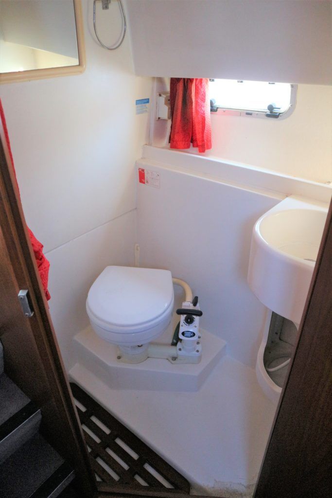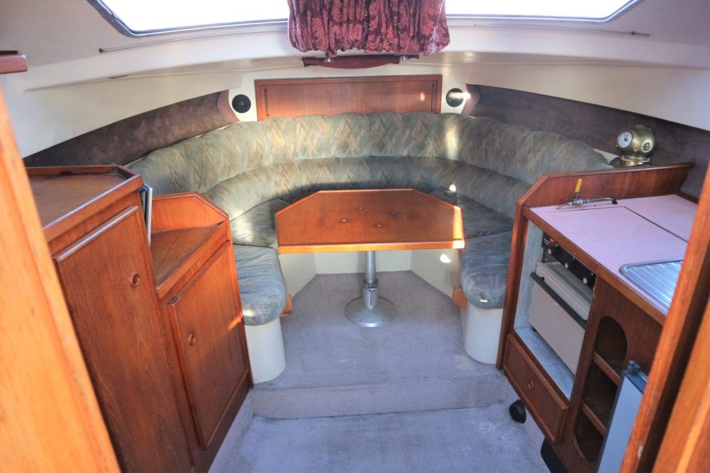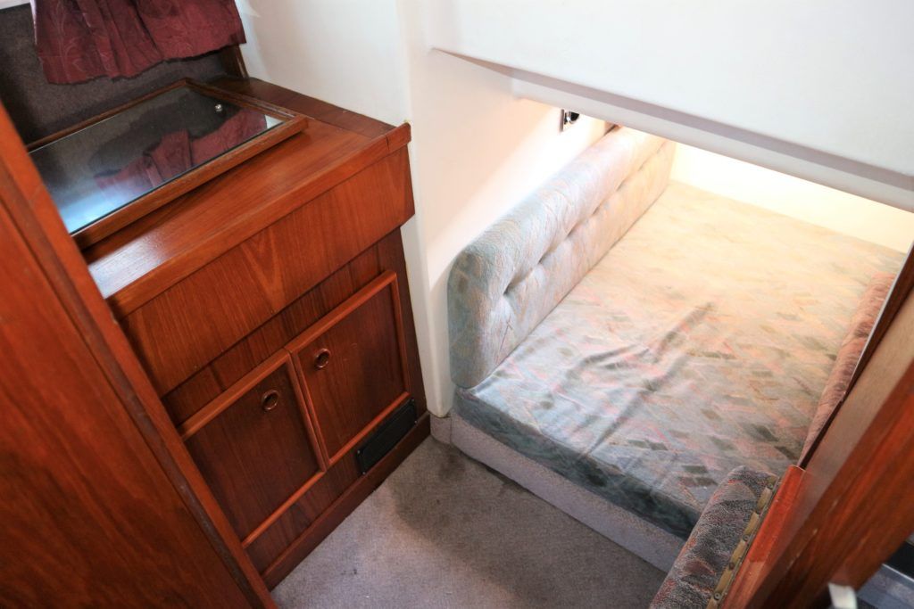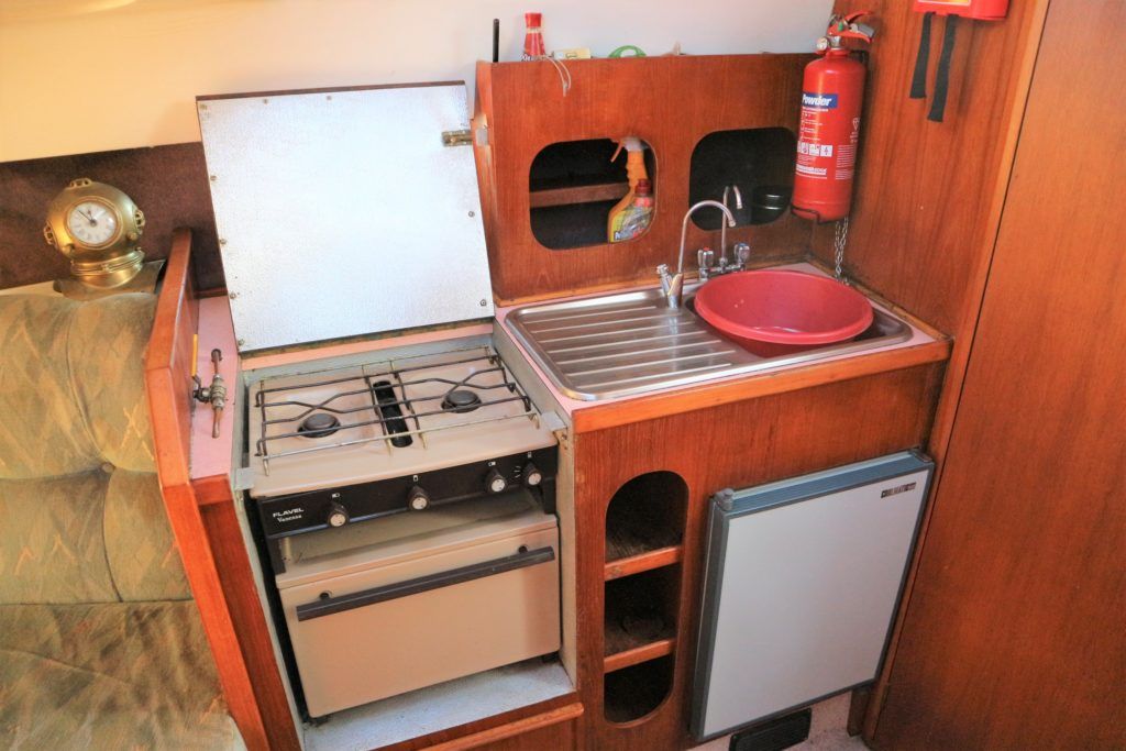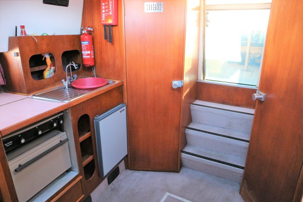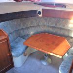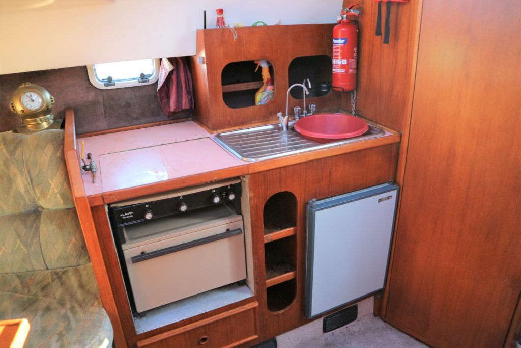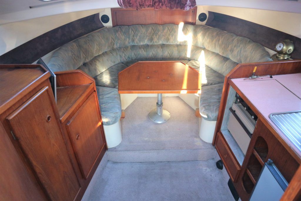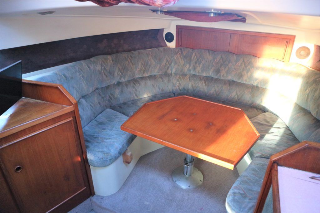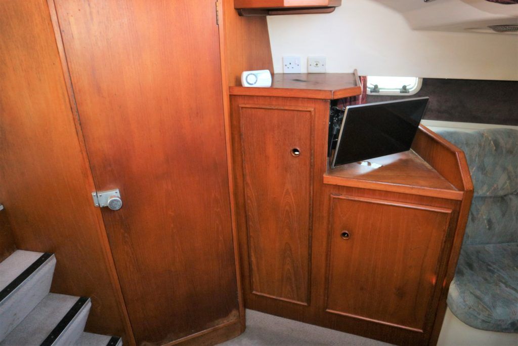 FALCON 27 – 1991 – Single Perkins 3 cylinder 29hp diesel engine on shaft. 4 berth accommodation with 1 x toilet to holding tank/shower compartment. Specification including Bow thruster, electric windlass, warm air heating, shore power, battery charger, folding windscreens and canopy arch giving a low air draft for increased inland waterway access. BSC 07/21. A sports style river cruiser with a large sociable cockpit and comfortable accommodation, benefiting from a smaller diesel engine on shaft drive for economical cruising.
