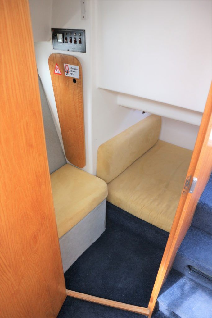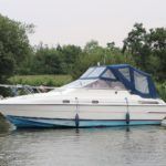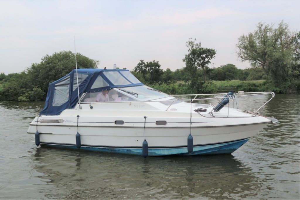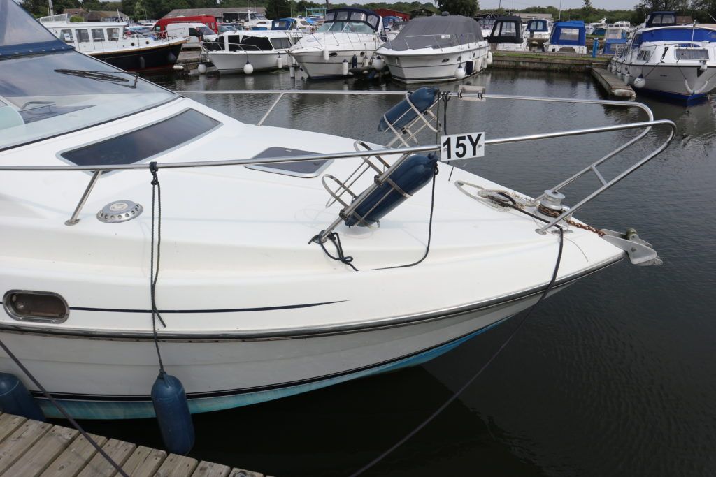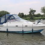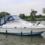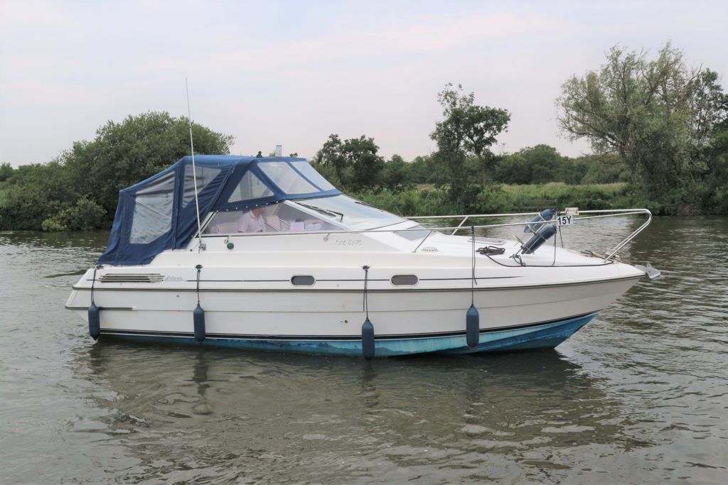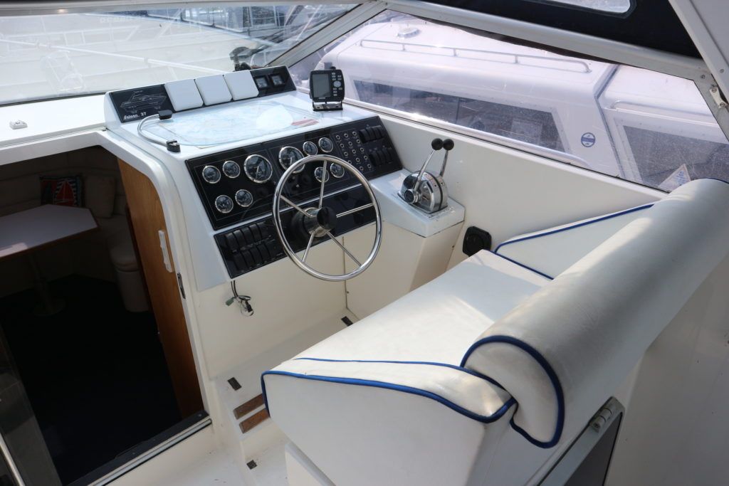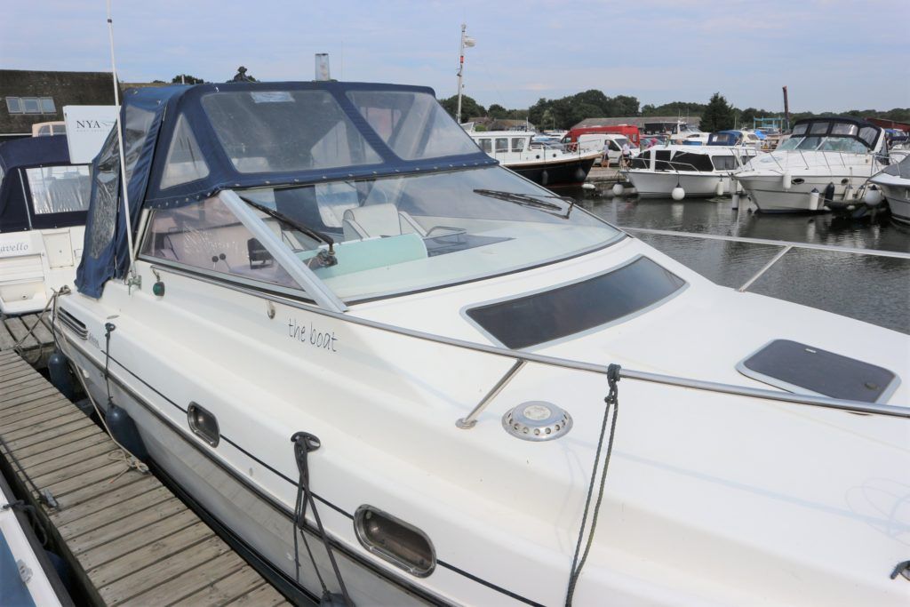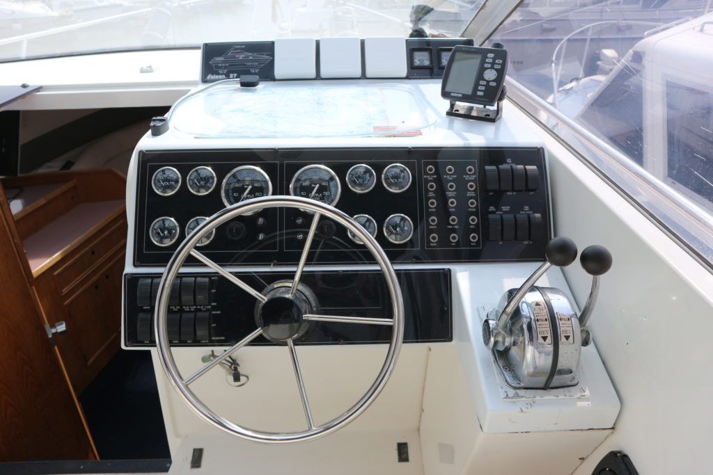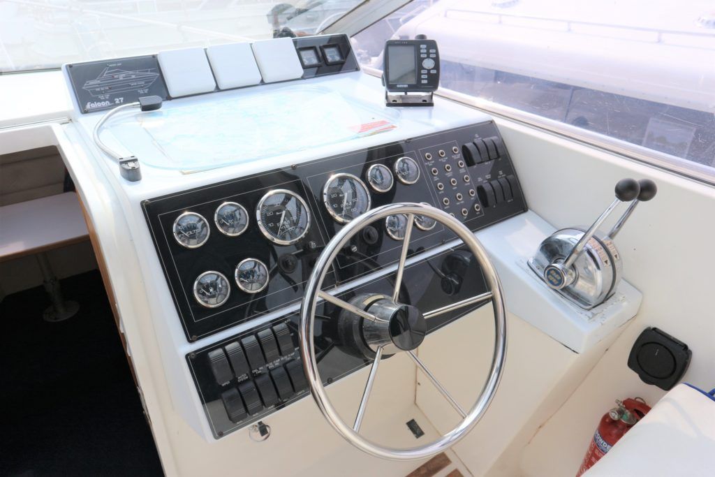 FALCON 27 – 1989 – 2 x Volvo AQ151C 146hp pertrol engines. 4 berth accommodation with 1 x toilet/shower compartment. Galley with 3 burner gas hob, fridge & sink. Specification including shore power, battery charger, immersion heater, anchor winch, speed & depth log, VHF, Garmin GPS, BSC10/20, engines serviced 08/19. A spacious sports cruiser with a sociable cockpit and generous accommodation.