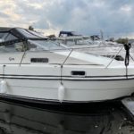 FALCON CAPRIOLE 24 – 1994 – Powered by a single Lombardini 22hp diesel through a shaft – 4 berth accommodation with toilet and shower – Specification to include; holding tank, shore power supply with battery charger and 240v sockets, warm air heating, hot and cold water supply, 2 burber hob, refrigerator. Engine service, antifoul and new canopy 2021. Folding canopy framework for reduced air draft and increased inland access. A perfect river cruiser with sought after diesel economy and shaft set up!