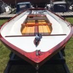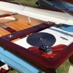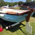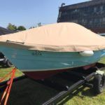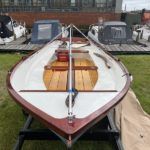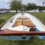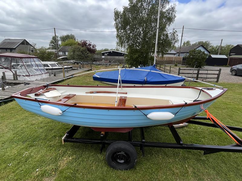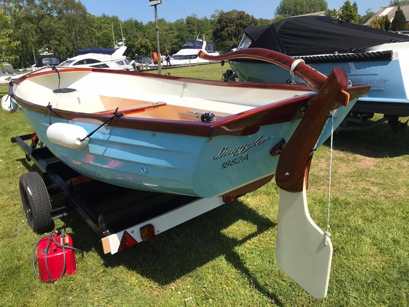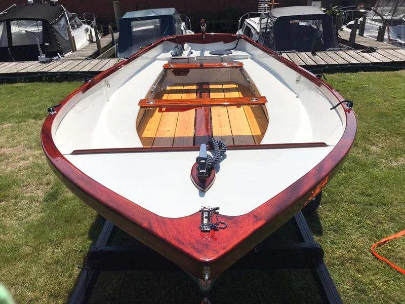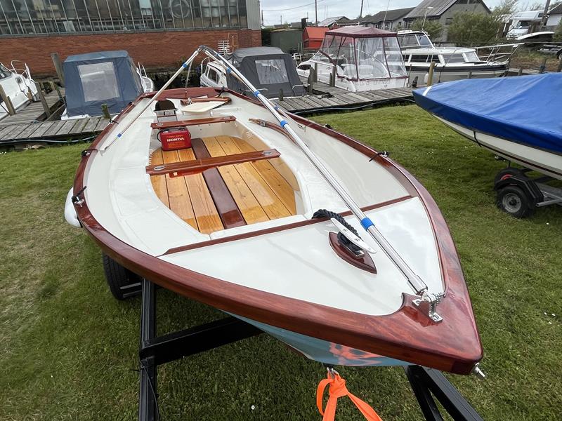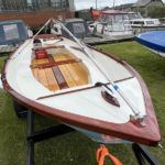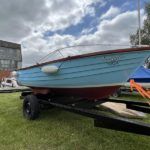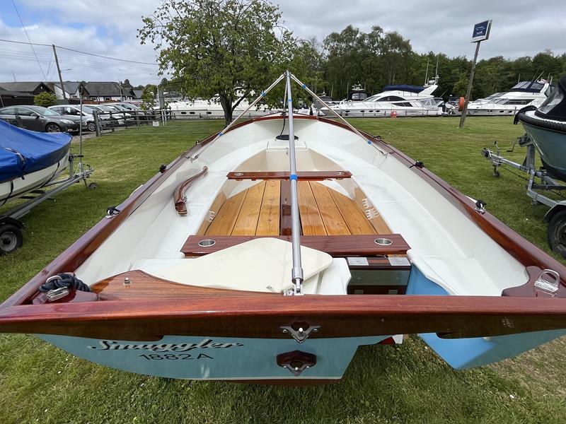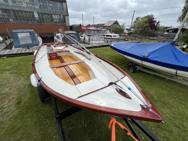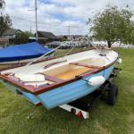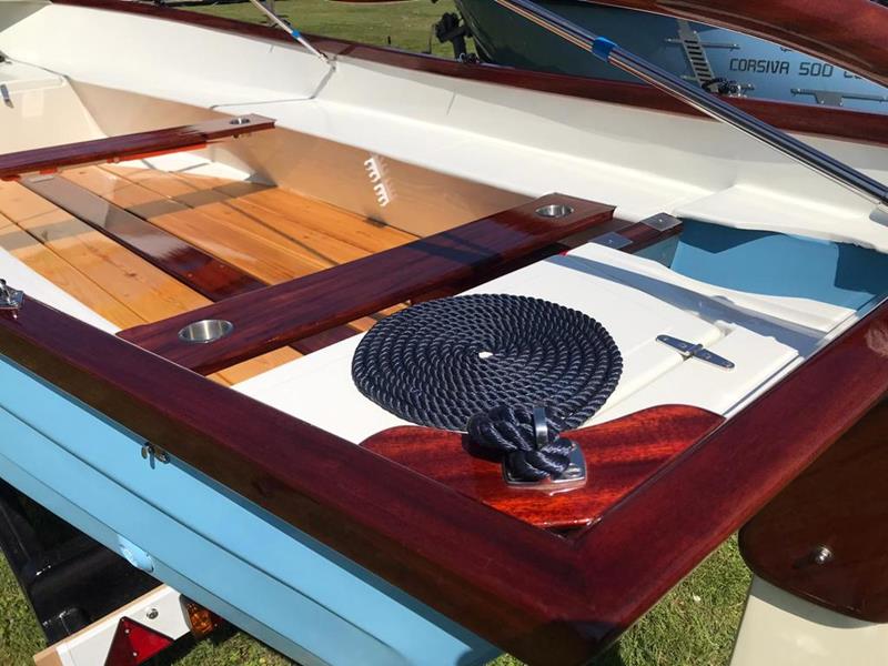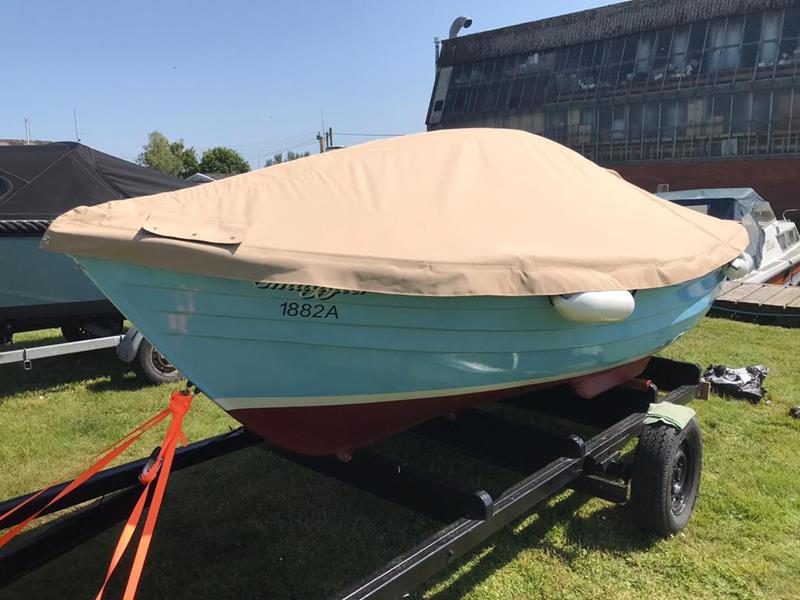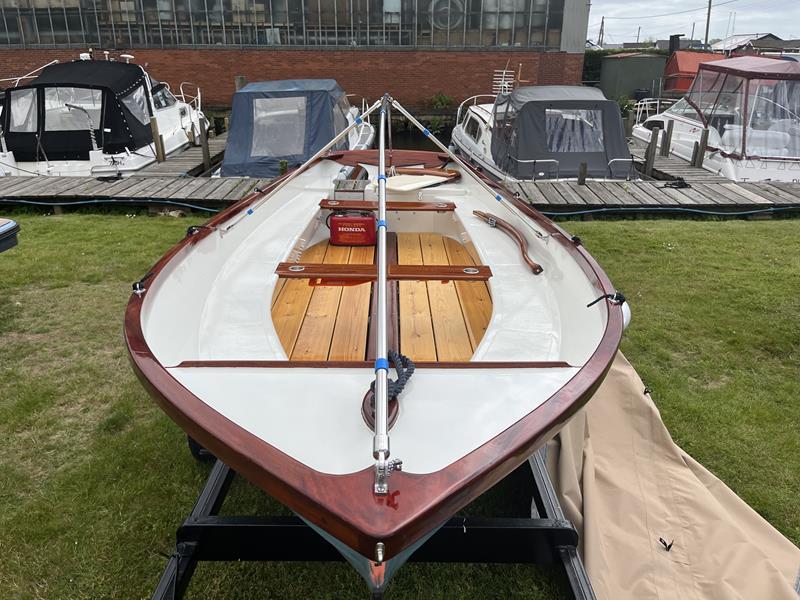 FALMOUTH BASS BOAT – Build estimated circa 1970s, Rebuilt 2022 – Powered by a Honda 6hp 4-stroke outboard engine – Overhauled by a talented local boat builder with excellent attention to detail. Bilge epoxied and painted, interior moulding fibreglassed, new fore deck, pine floorboards with mahogany centre plank, mahogany seats with cup holders, mahogany and stainless steel outboard bracket, fore and aft storage lockers, wale gusher bilge pump. New cover with framework, 2x tillers, Mahogany lifting rudder, finished in a gloss UV-protected varnish, antifouling. A beautifully finished craft, ideal for fishing, camping and day trips.