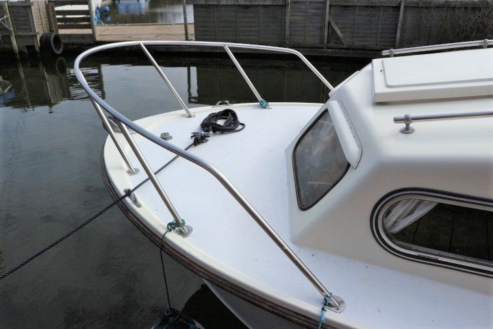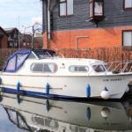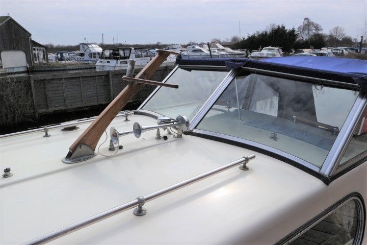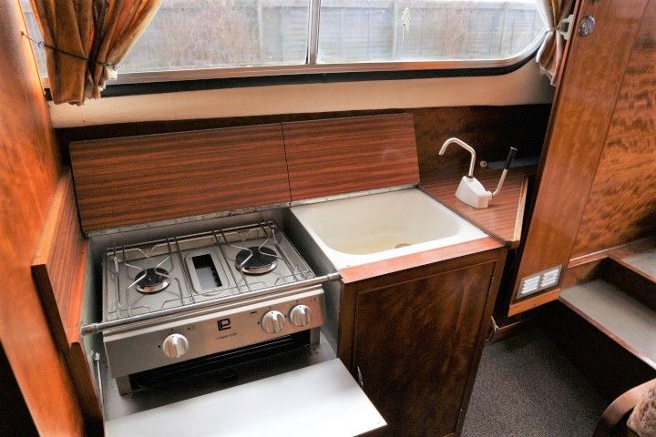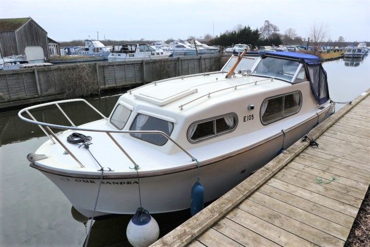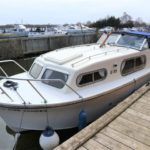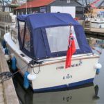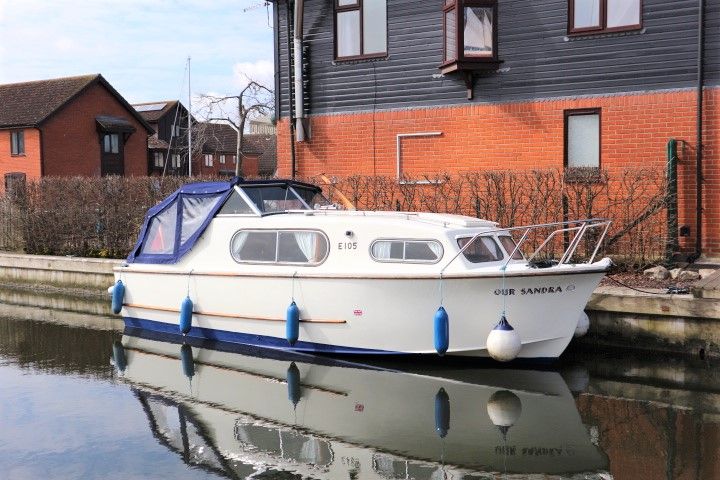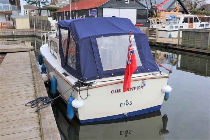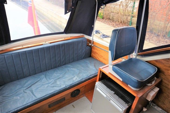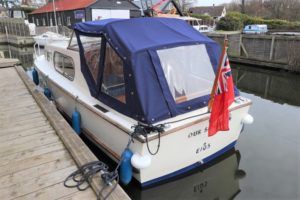 FREEMAN 23 – Circa 1974 – Powered by 1 x Watermota Petrol Engine. Four berth accommodation with 1 x toilet (porta loo) compartment. Galley with new 2 burner hob/grill & electric fridge, sink with cold water supply. Spec including shore power. BSC 08/20.  A tidy example of these ever popular classic River Cruisers with the benefit of a new canopy in 2017, engine service 07/17 and Antifouling in 2018.