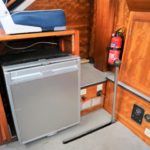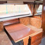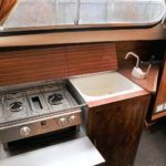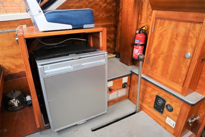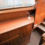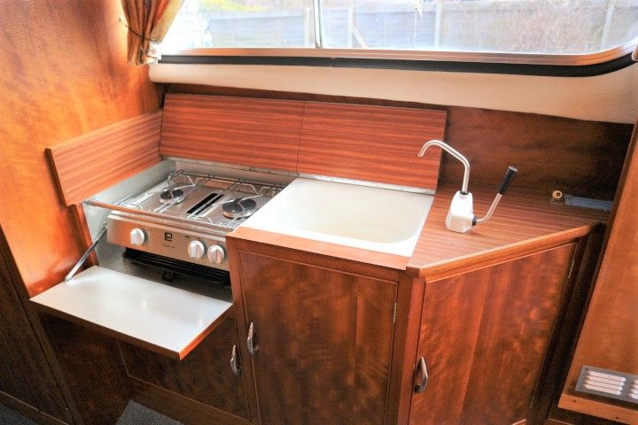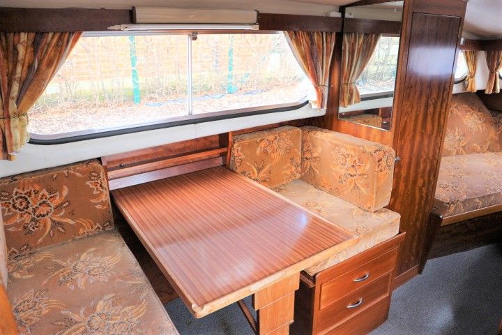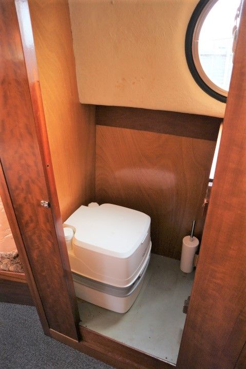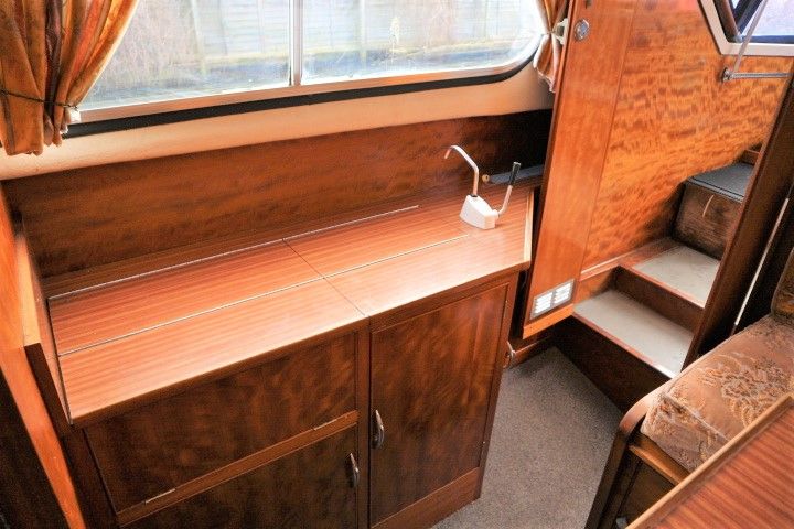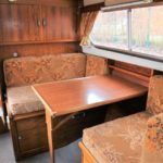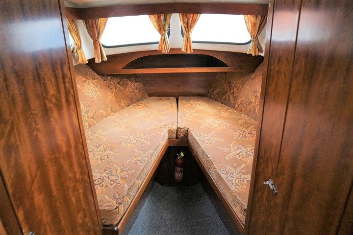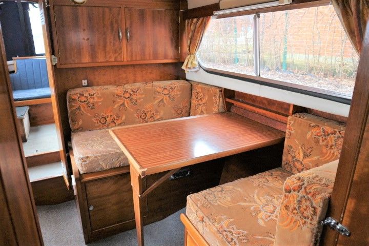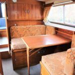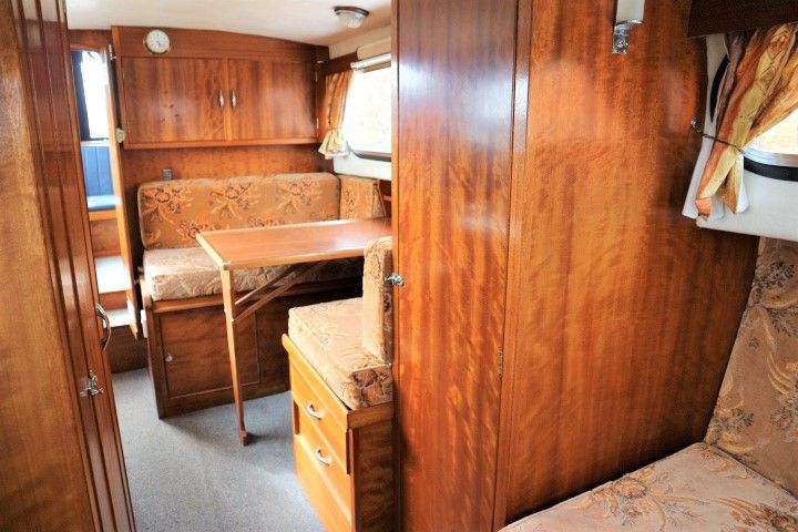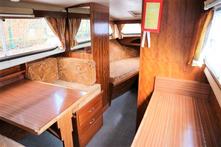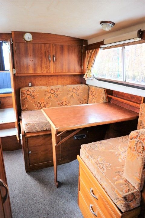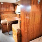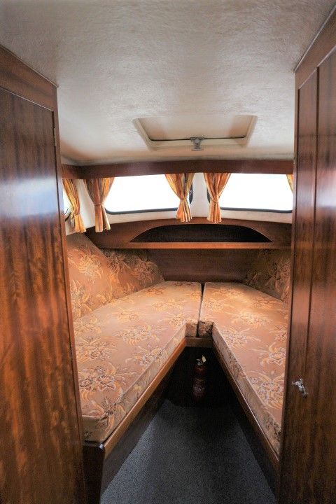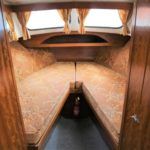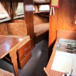 • Traditional Freeman layout with V berth in fore peak with infill to create a double berth.  Toilet compartment equipped with porta loo.  Full length hanging locker with hidden partition door allowing forward cabin privacy.  Dinette midships with drop down table converts to a double berth.  The galley area is conveniently placed opposite. There is a range of cupboards, drawers and lockers in the main saloon/galley area. Door leading up to cockpit.