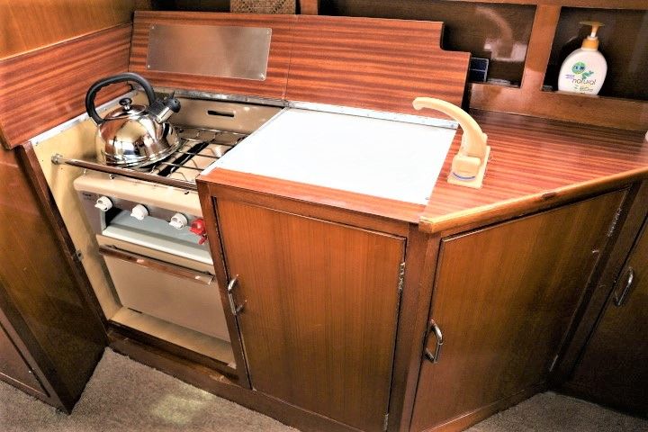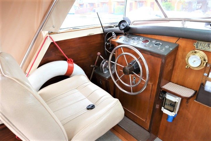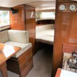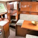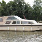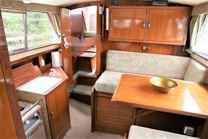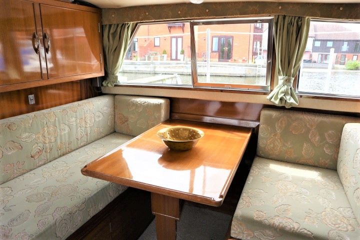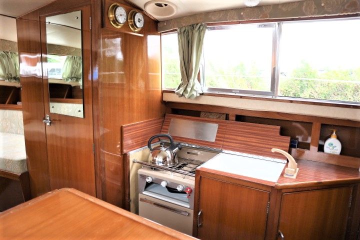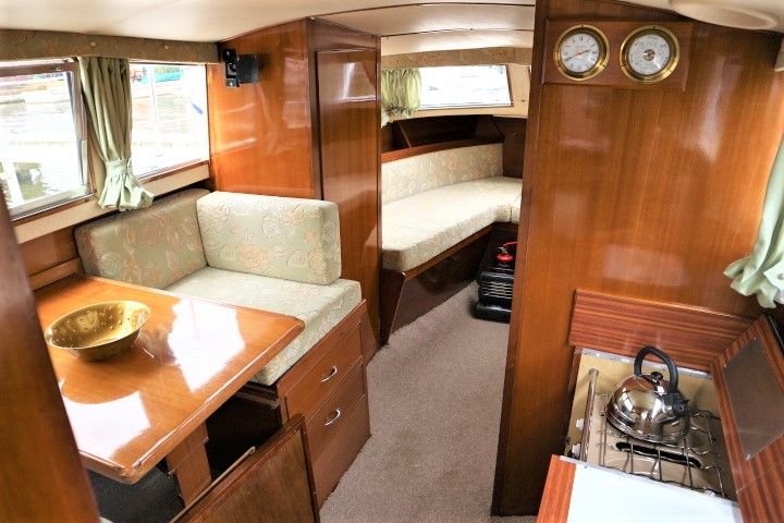 FREEMAN 24 – 1979, Ford Sea Tiger 60hp petrol engine. 4 berth accommodation, toilet to holding tank, two burner with oven and grill, Waeco fridge, hot and cold water, shore power, BSC 08/21. Grp semi hard top with opening sunroof & rear canopy. A good example of these popular, characterful river cruisers with her internal woodwork remaining in great condition, must be seen!