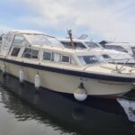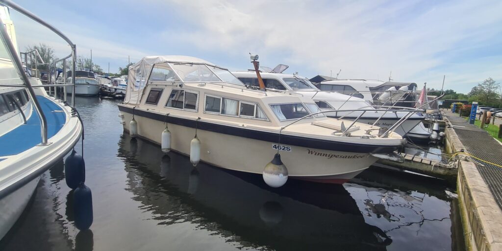 Freeman 27 – 1980 – Single JGM/BMC 1800D/H2H 50 hp diesel engine through a shaft. 4 berth accommodation with a single toilet & shower compartment. Specification to include; battery charger, warm air heating, folding windscreens and canopy, holding tank, navigation lights. “Winnipesaukee” is a lovely, well cared for example of these popular Freeman boats and comes with a good service history. She benefits from having folding screens, allowing access under most Broads bridges. More pictures to follow. BSC 31/08/26