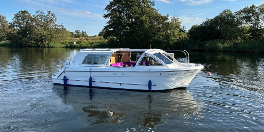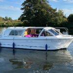 Funnel 27 FD – 2015 – 1 x Nanni N3 30hp diesel engine (277 hours). Spacious accommodation for up to 4 with Electric toilet/shower compartment. A generous specification including; Bow and stern thrusters, electric windlass, shore power, battery charger, inverter, immersion heater, reversing camera, eberspacher warm air heating, holding tank and teak & holly flooring throughout. Antifouled and serviced March 2025. BSC 2028. A modern, well-specified forward-drive river cruiser, complete with a split sliding roof and low air draft, ideal for extended river cruising. Early viewing recommended!