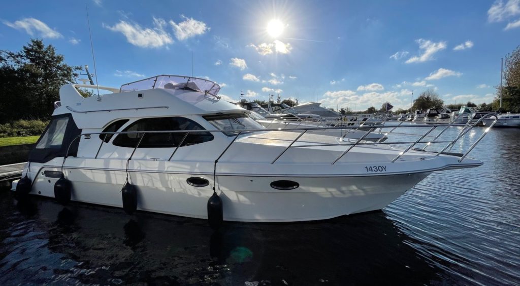 GALEON 380 FLYBRIDGE – 2005 – Powered by twin Volvo AD41 200hp diesel through sterndrives – 4 berth accommodation with toilet and shower – Specification to include; Bowthruster, trim tabs, shore power with 240v sockets , warm air heating, Garmin chartplotter, VHF, electric windlass, inverter. Recent hull polish, antifoul and drive service. A well presented, well equipped flybridge cruiser. Plenty of comfort and performance, perfect introduction into family offshore cruising!