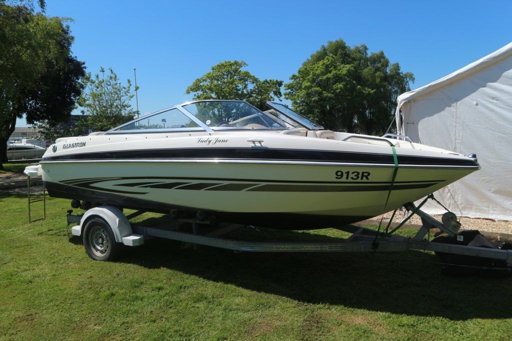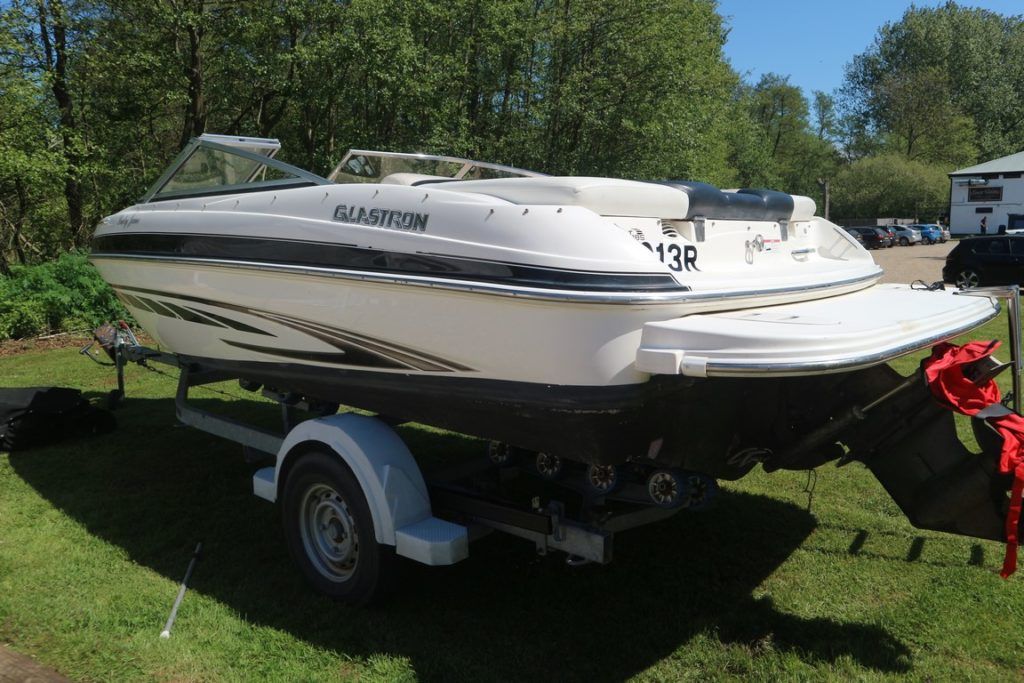 GLASTRON GT185 – 2008 – Powered by a single Mercruiser 4.3TKS 190hp inboard petrol engine. Electric drive tilt, engine instruments, navigation lights, all-over cover, split windscreen. A real head turner, striking design. Ideal for water sports! Trailer included.
