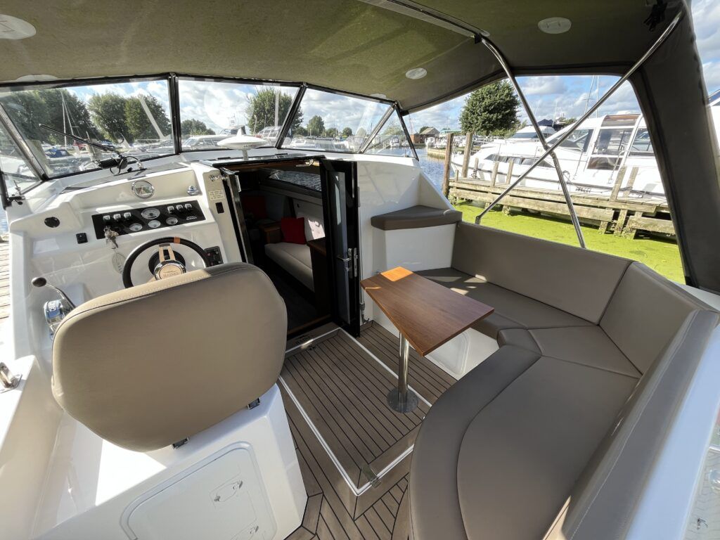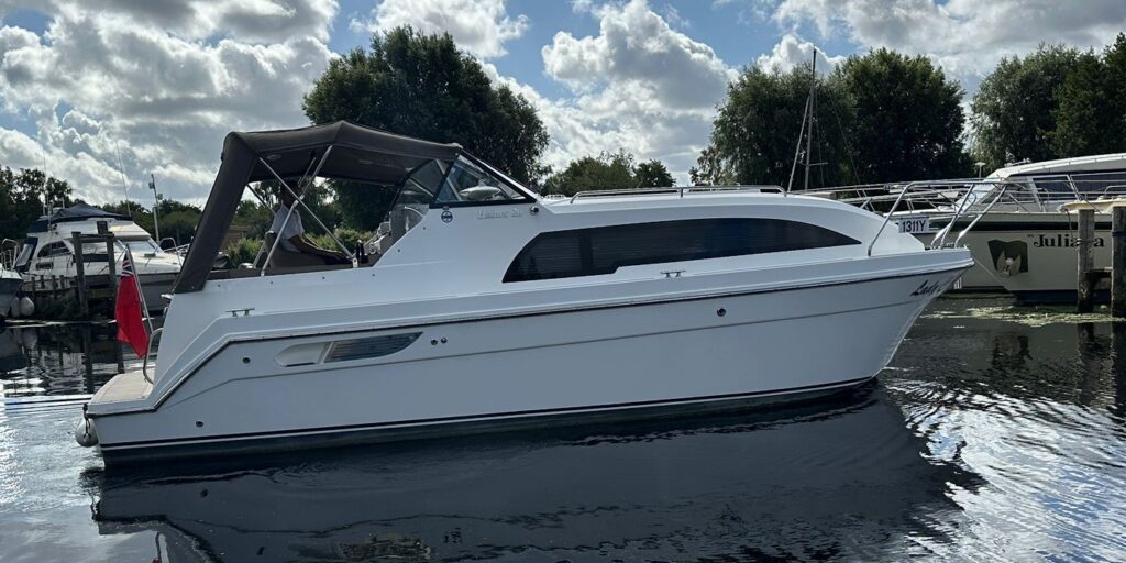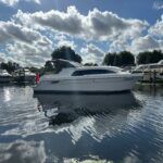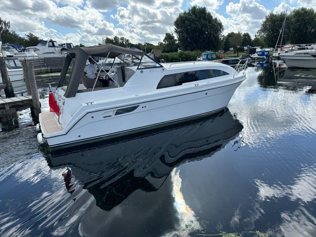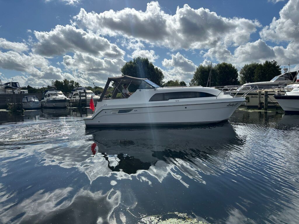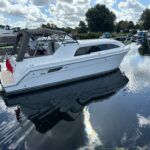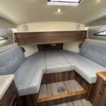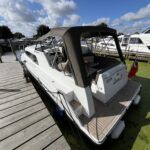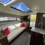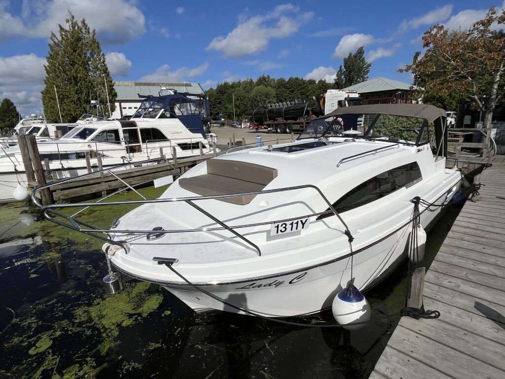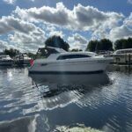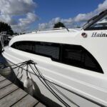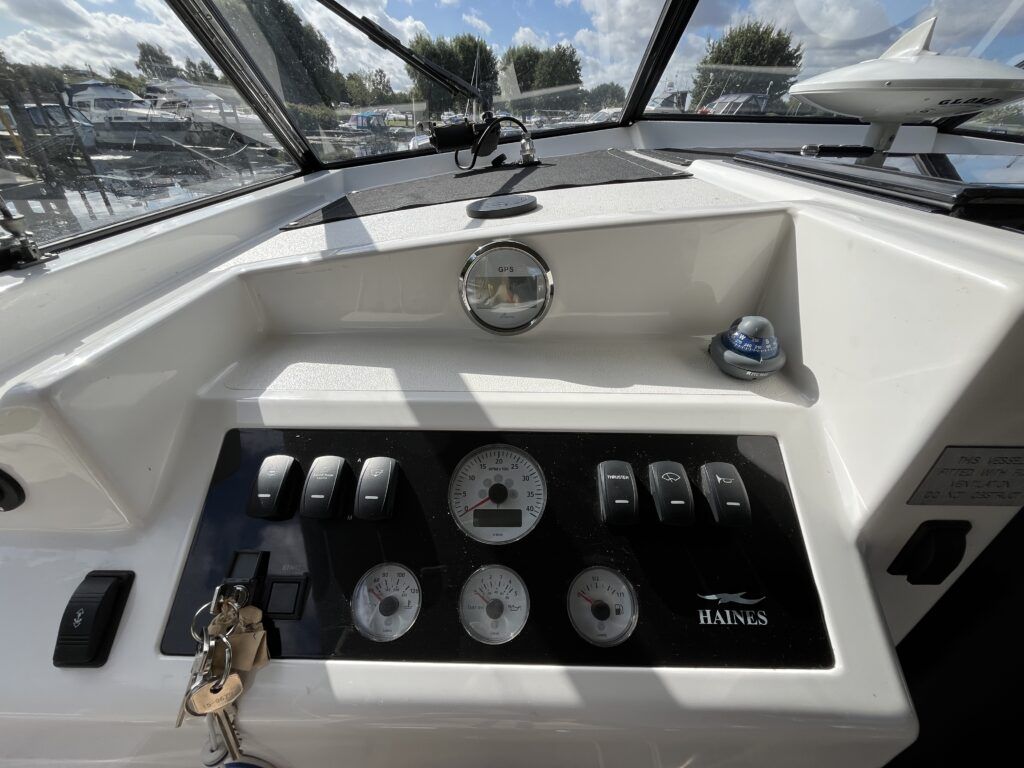 Haines 26 – 2017– Powered by a N4.38 38hp Nanni diesel engine. Open plan cabin layout, accommodating up to 4 with a toilet and shower. Finished beautifully in walnut with Amtico flooring to complete the contemporary look. Specification including bow and stern thrusters, electric windlass, battery charger/inverter, immersion, shore power, warm air heating, electric toilet to holding tank, folding screens & canopy arch and more. BSC 11/29. A stylish and sociable design, perfect for cruising the inland waterways.