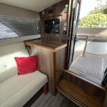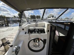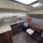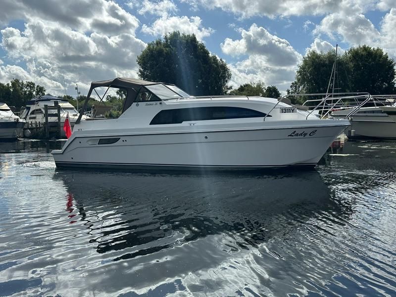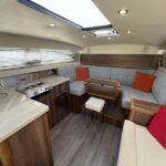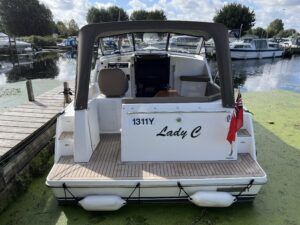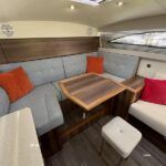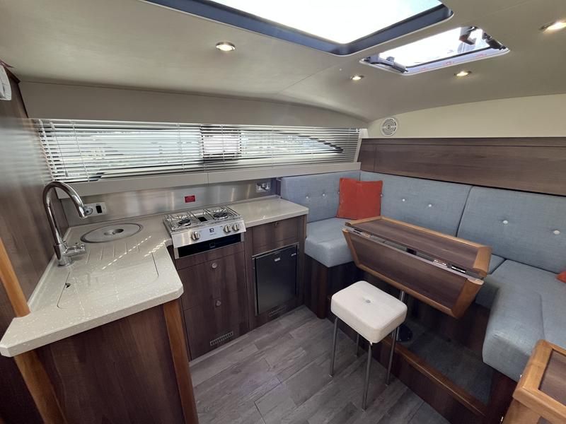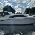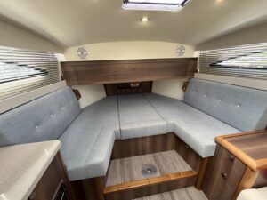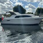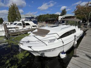 Haines 26 – 2017 – Powered by a N4.38 38hp Nanni diesel engine. Open plan cabin layout, accommodating up to 4 with a toilet and shower. Finished beautifully in walnut with Amtico flooring to complete the contemporary look. Specification including bow and stern thrusters, electric windlass, battery charger/inverter, immersion, shore power, warm air heating, electric toilet to holding tank, folding screens & canopy arch and more. BSC expires Nov 2029. A stylish and sociable design, perfect for cruising the inland waterways.