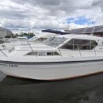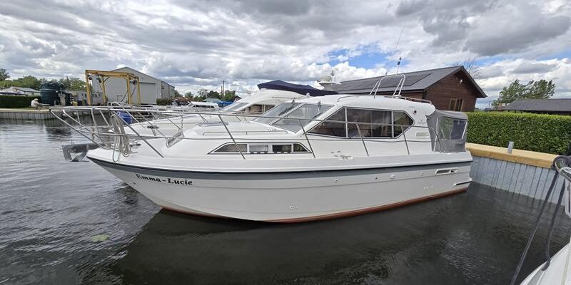 Haines 31 Coastal – 1997 – Powered by a Perkins M135L 135hp diesel engine on a shaft. 4 berth accommodation with a separate toilet and shower compartment. Well specified including; Bow thruster, electric winch, generator, shore power, warm air heating, holding tank, hydraulic steering, summer and winter canopies, teak bathing platform/cockpit, calorifier/immersion, autopilot and more. Antifouled 2024, Engine serviced 2025. A sought-after Haines 31 Coastal – versatile for both inland and coastal cruising, and perfect for year round boating.