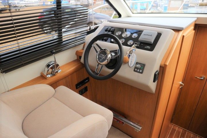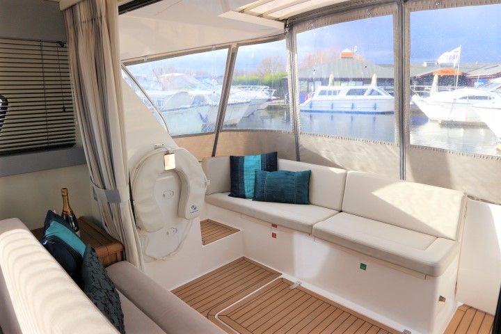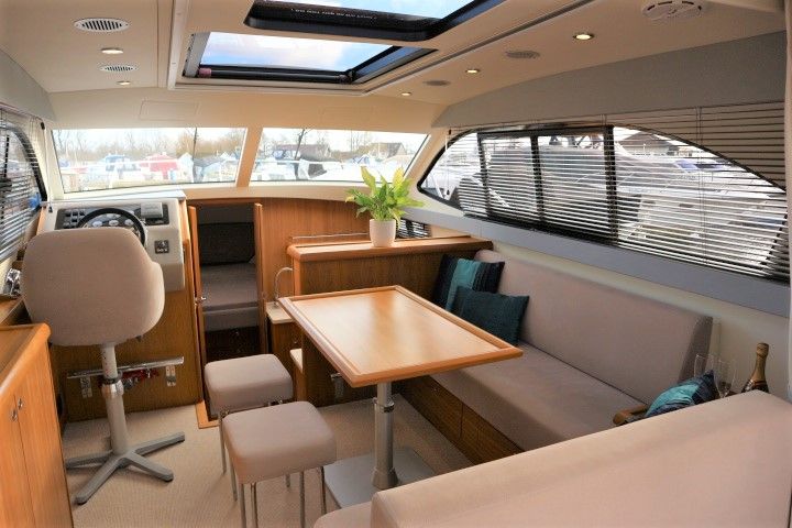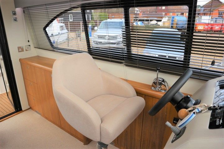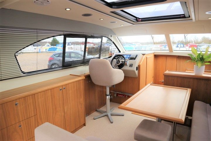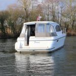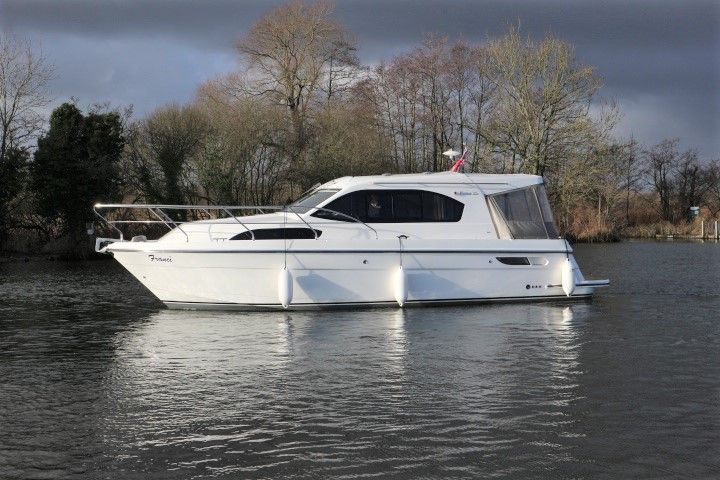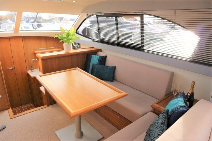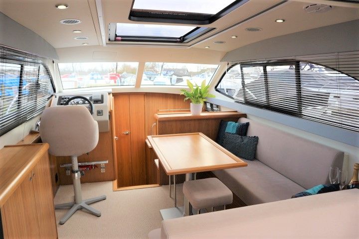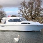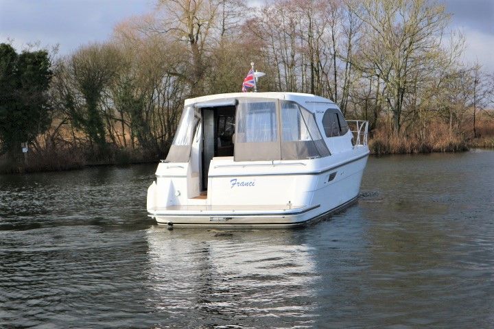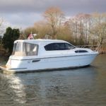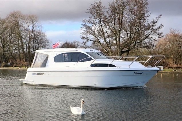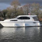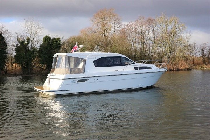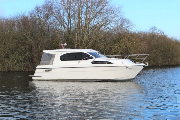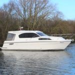 HAINES 32 SEDAN – 2014 – Powered by 1 x Nanni 60hp Diesel engine. Luxury 4 berth accommodation in one cabin & saloon with 1 x toilet/shower compartment. Specification including bowthruster, electric windlass, shore power, battery charger, inverter, immersion, warm air heating, speed & depth log, synthetic teak decking to bathing platform and cockpit. A luxurious well fitted river cruiser with a sociable saloon/cockpit space for entertaining.