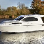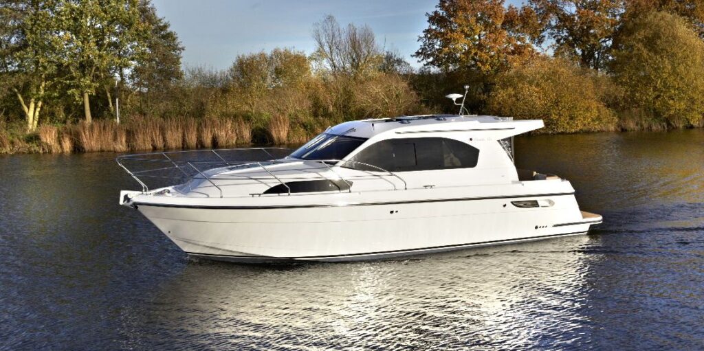 HAINES 32 Sedan – 2012 – Powered by a Nanni 43hp diesel engine. 4 berth accommodation with a large island double berth and a convertible double saloon berth. Specification to include; Bow thruster, electric toilet with holding tank, heating, frameless dark tint windows, Garmin depth and speed, battery charger, immersion, electric windlass, synthetic teak bathing platform, avonite galley work surface. New canopy 2022. Serviced and antifouled 2023. A luxurious river cruiser offering effortless handling, beautifully finished in walnut.