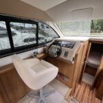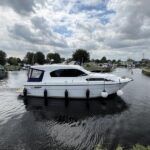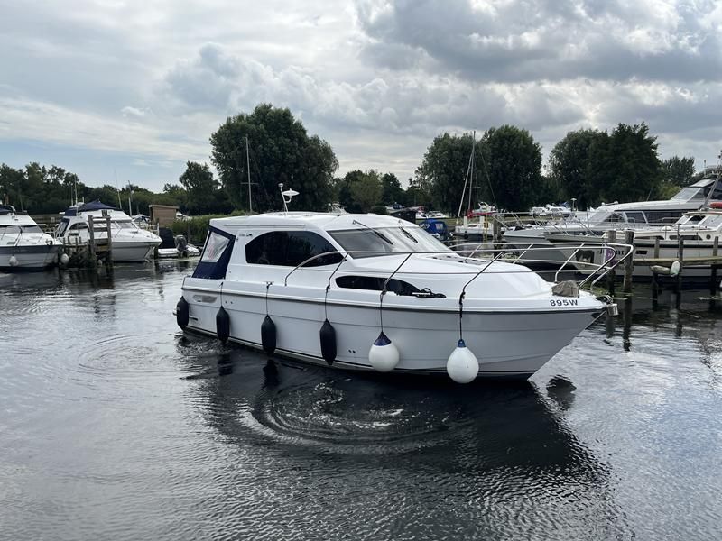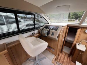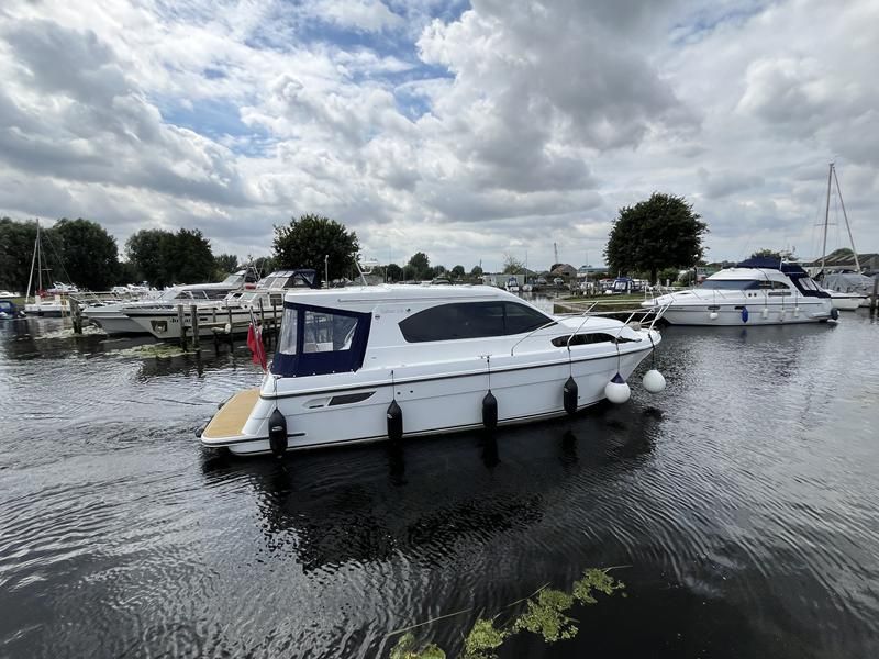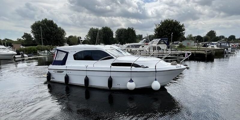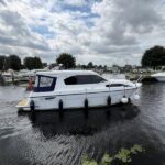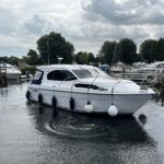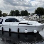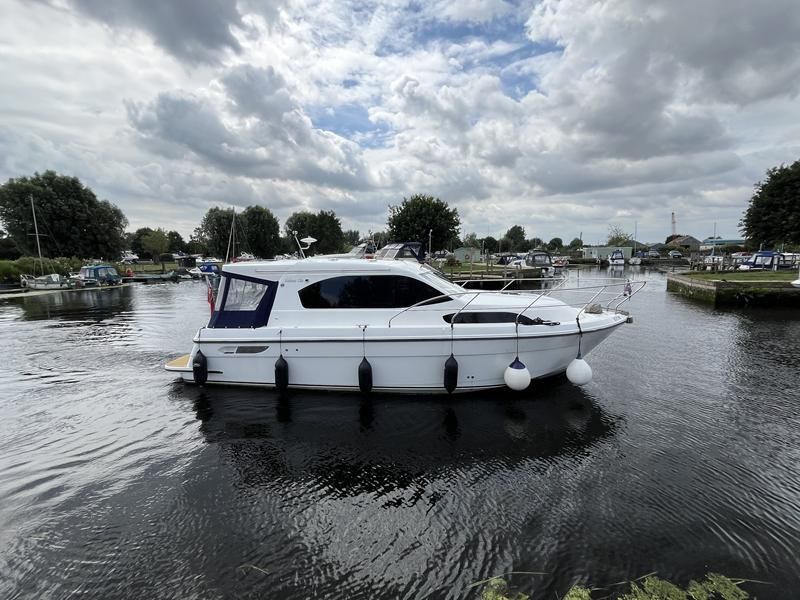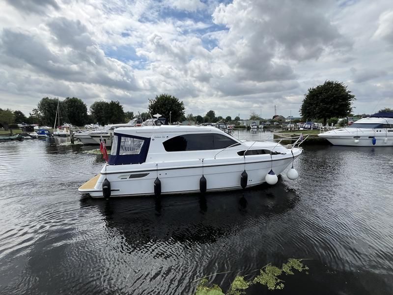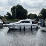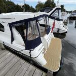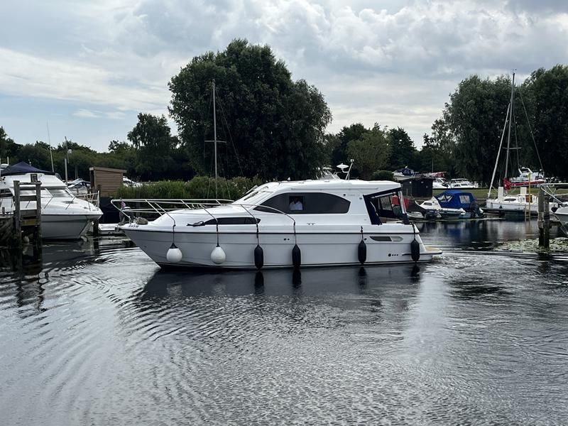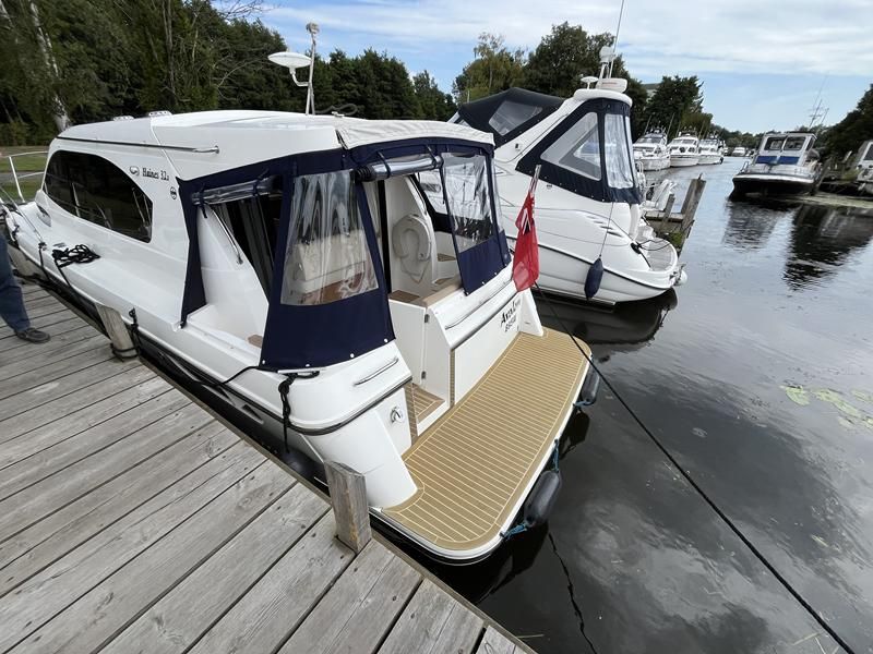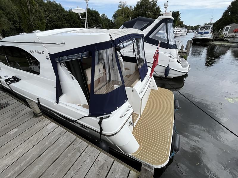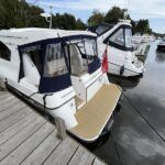Haines 32 Sedan – 2014 – Powered by a single Nanni 43hp diesel through a shaft. Up to 4 berth accommodation with Island double master cabin & electric flush W/C and shower. Specification including bow and stern thrusters, warm air heating, shore power, battery charger, immersion, synthetic teak laid bathing platform & cockpit, sliding saloon sunroof, and more. Beautifully finished to the usual high standard of Haines with a comfortable saloon and well appointed galley. A very lightly used example of these ever popular Haines river cruisers with only 295 engine hours, perfect for exploring the inland waterways in comfort and style!