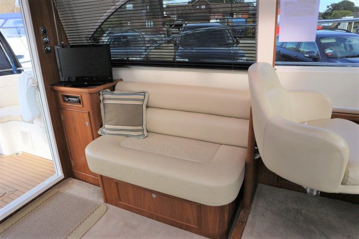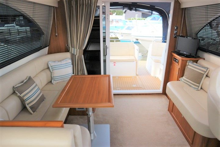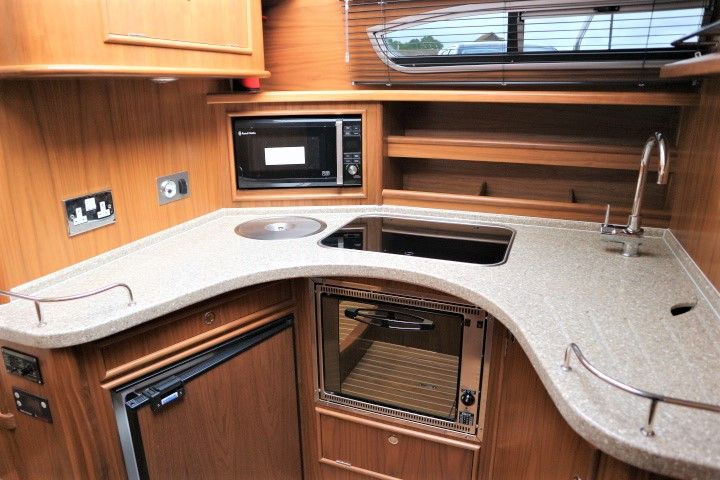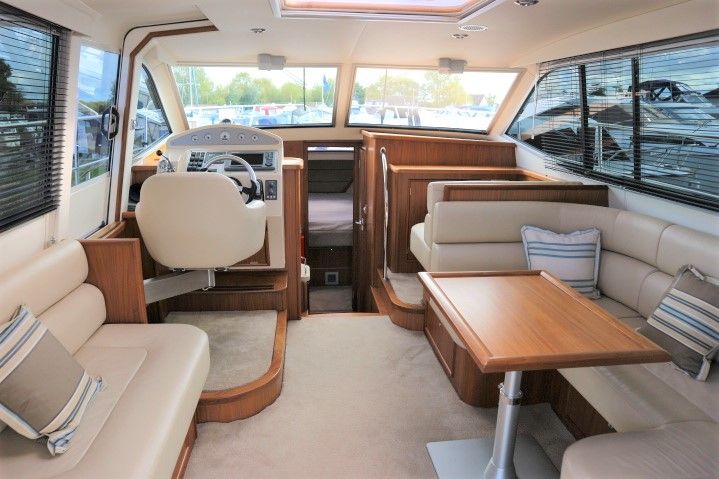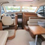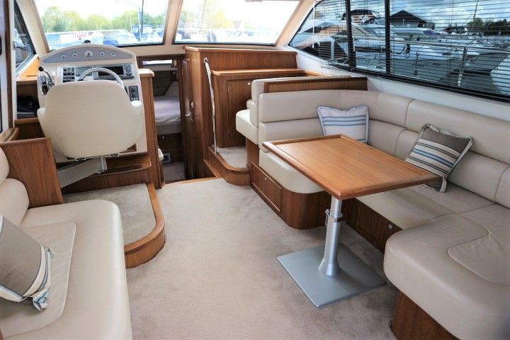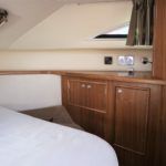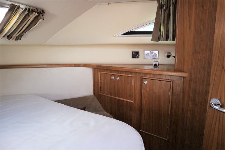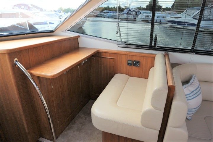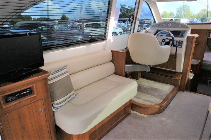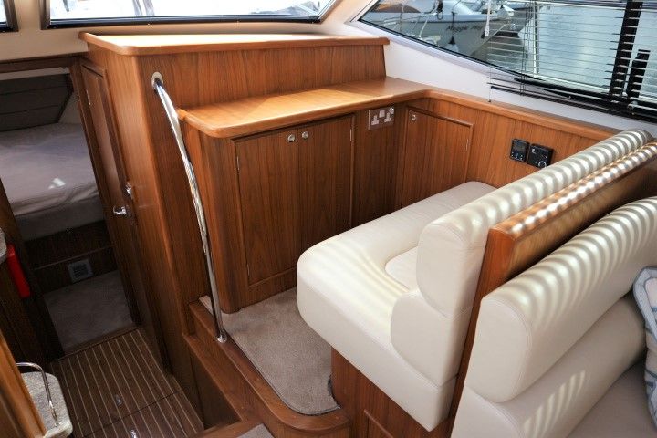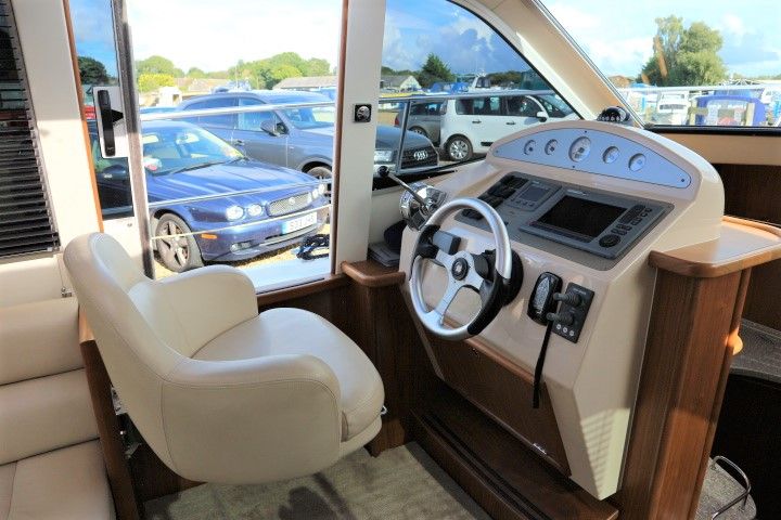 HAINES 35 SEDAN – 2011 – 1 x Nanni T.4200 (200hp) diesel engine. Luxury 4 berth accommodation with Island double berth cabin & 1 x electric WC and shower compartment. High specification including bow and stern thrusters with remote, 4KW Generator, warm air heating, inverter/battery charger, immersion heater, Leather upholstery, electric anchor winch, Avonite galley work surface, teak & holly galley flooring, synthetic teak bathing platform and cockpit, wet bar & second fridge, Raymarine Chart Plotter, Autohelm ST60 Tridata, Tracvision. A truly sumptuous boat with exquisite build quality throughout, finished in Walnut.