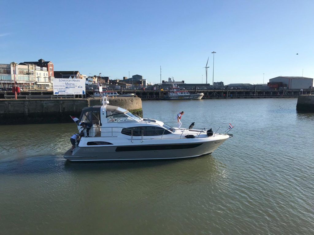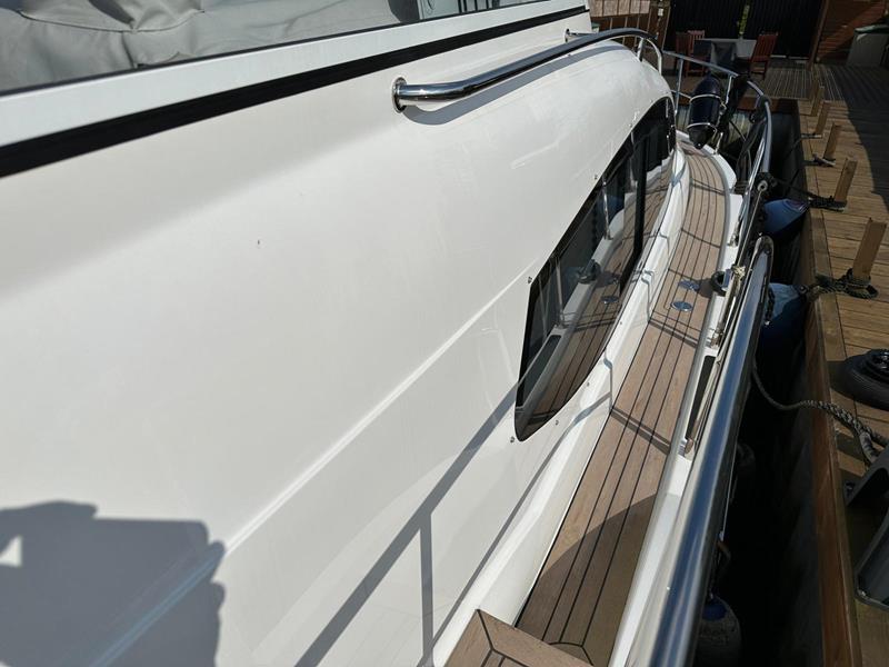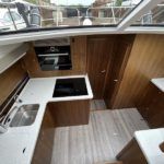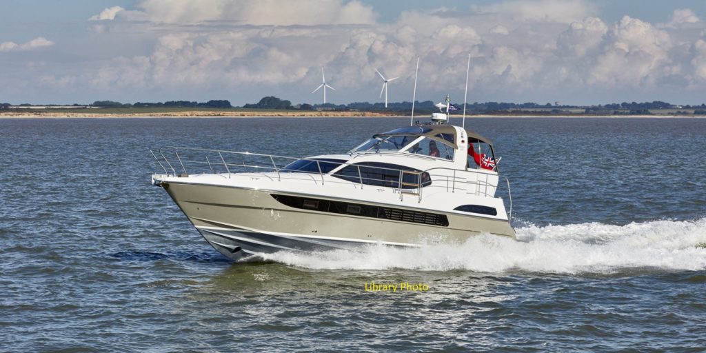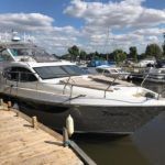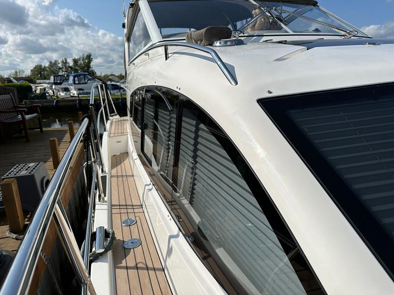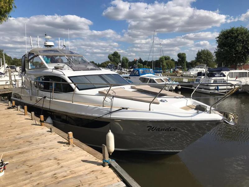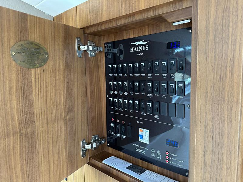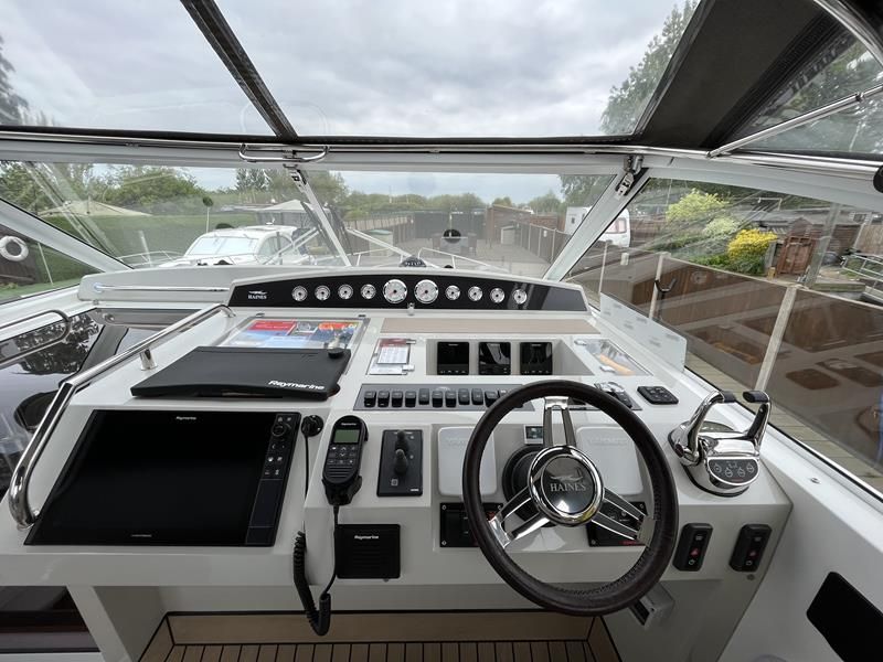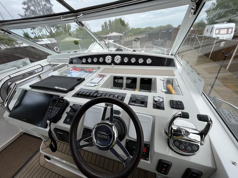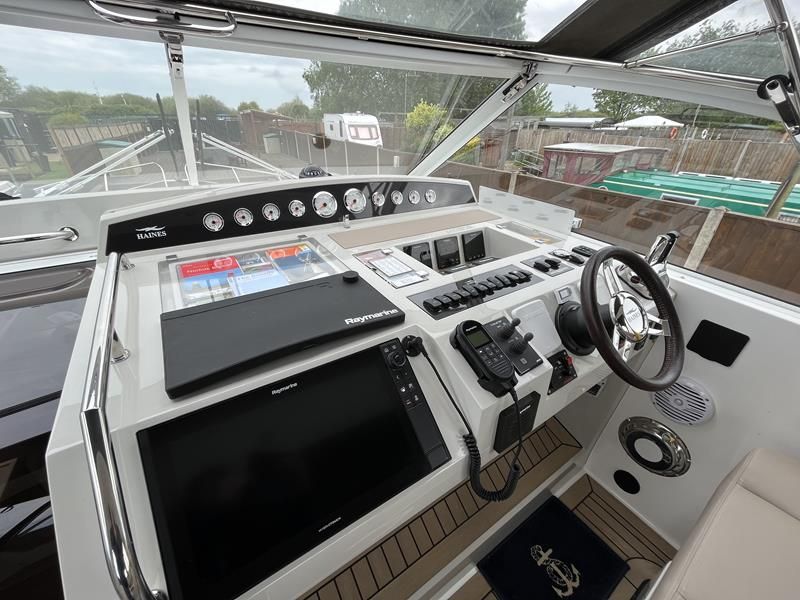 Haines 400 – 2018 – 2 x Yanmar 8LV 370hp diesel engines. Serviced Dec 23. Luxury 4 berth accommodation over two island double en-suite cabins. Spec comprising of Eberspacher Hydronic D5 heater, bow and stern thruster, Victron inverter/120amp battery charger, Fischer Panda generator, electric windlass, hydraulic arch, a range of Raymarine navigation equipment to include; plotter, radar, autopilot, 3D vision, MFD, AIS and VHF. Synthetic teak laid cockpit, bathing platform and decks. A unique opportunity to own a Haines 400, the flagship of the range, which has been beautifully finished in walnut to the renowned high standards of Haines.