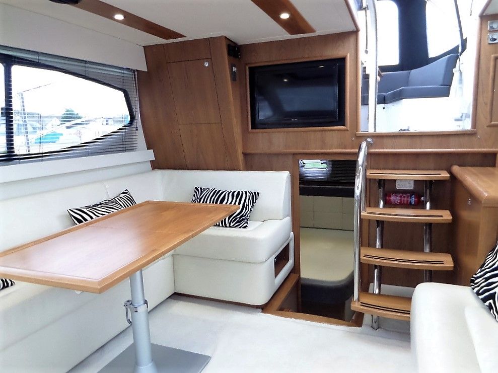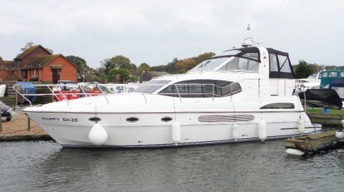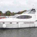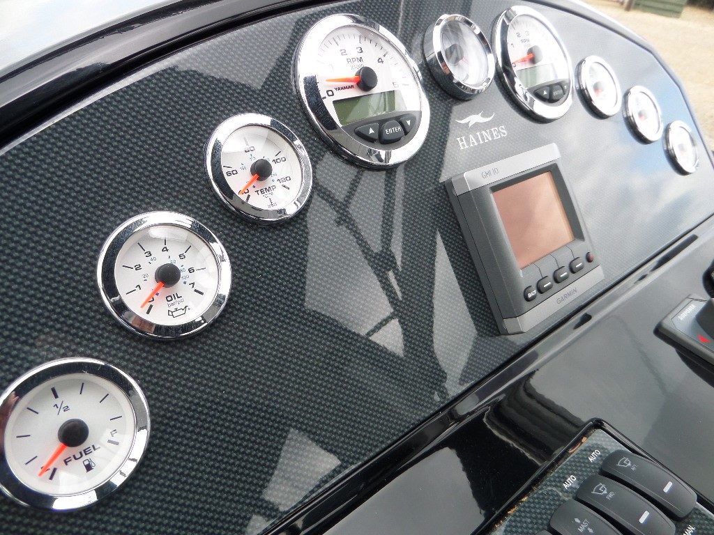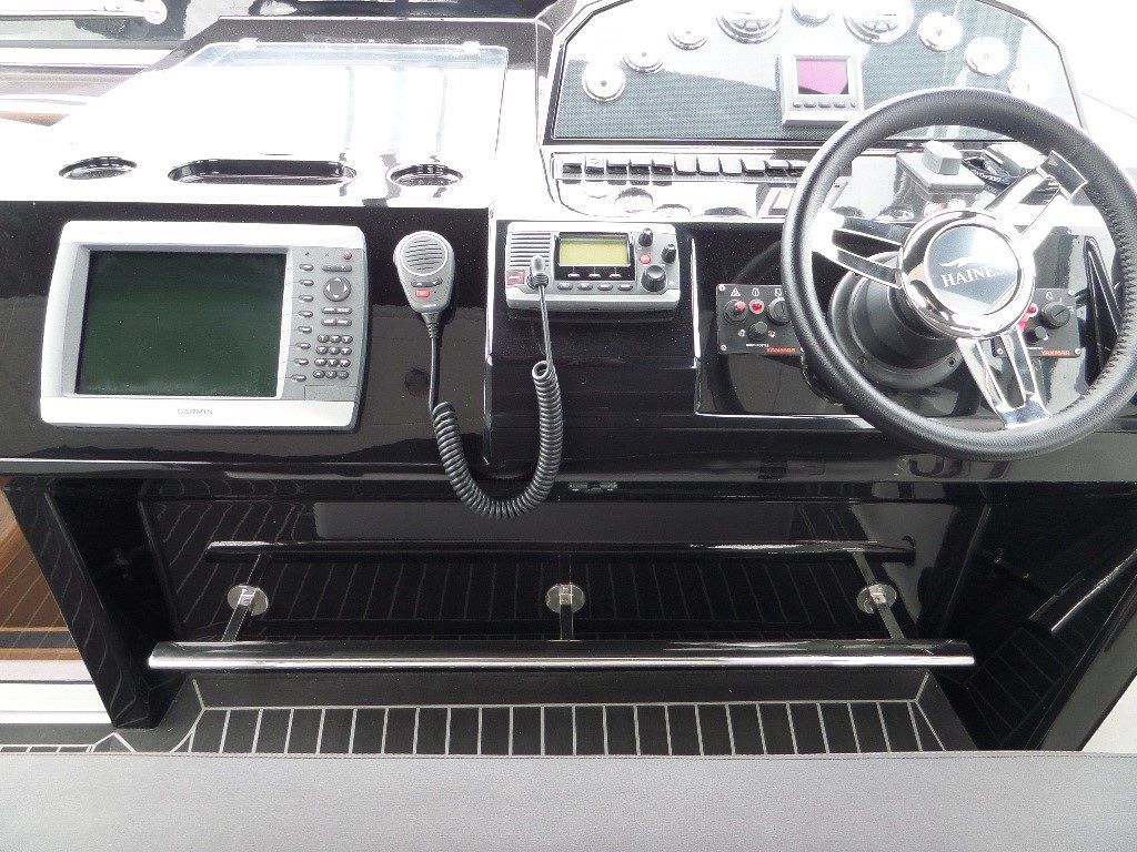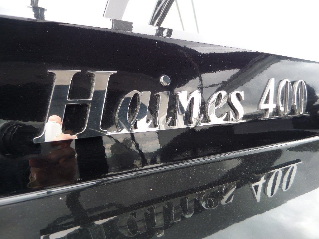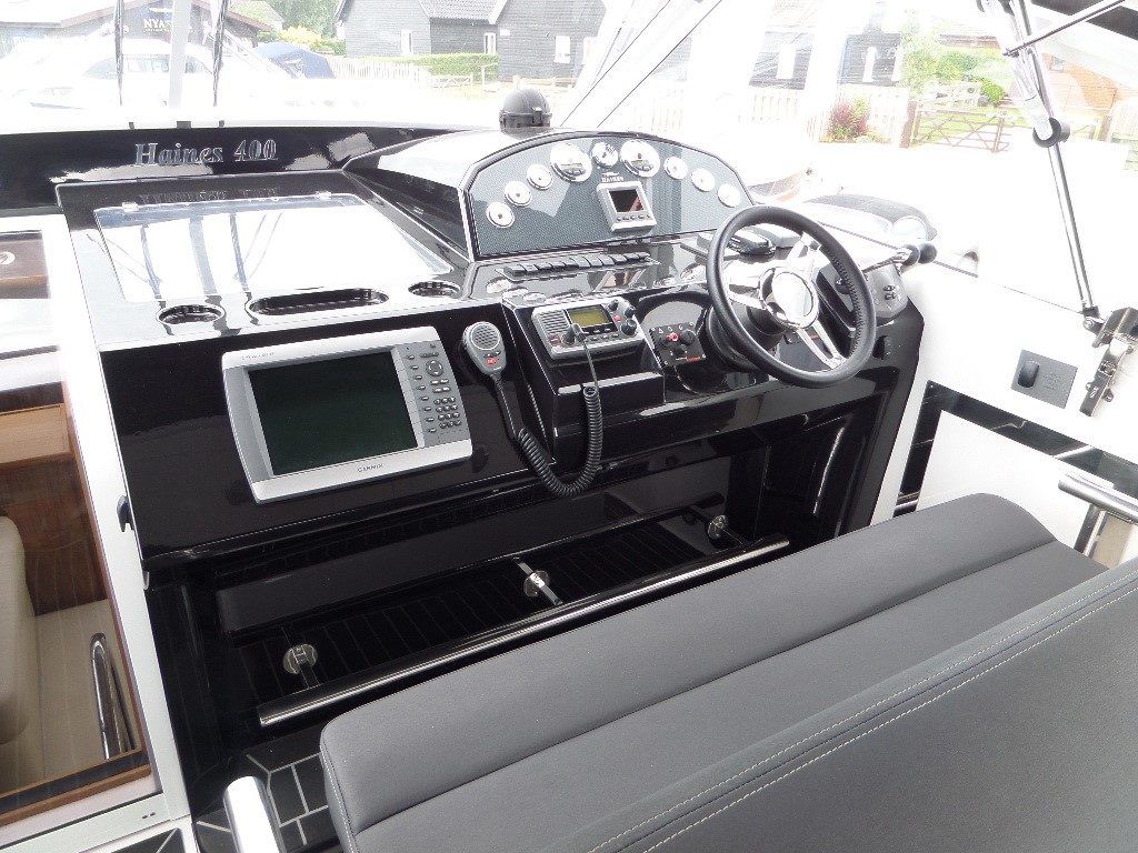 HAINES 400 – 2013. Twin Yanmar Diesel 220hp engines. 6 berth accommodation in 2 spacious cabins with island double berths, both with en-suite and a further double conversion in the Saloon. A highly equipped example with remote controlled bow and stern thrusters, electric anchor winch, 2KW inverter/battery charger, hydraulic folding radar arch, Garmin nav suite, centre lift davit, Hydronic heating system, charcoal and grey teak deck to cockpit, steps & bathing platform. A truly stunning boat beautifully finished in walnut and leather in superb condition.