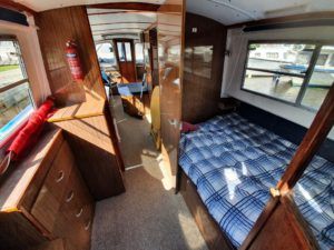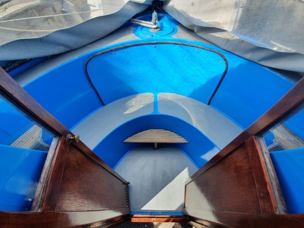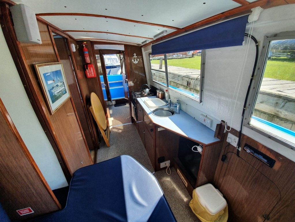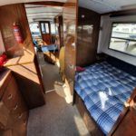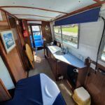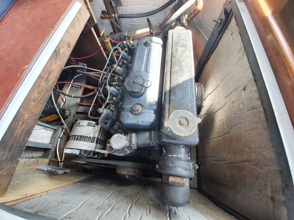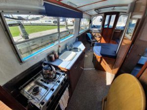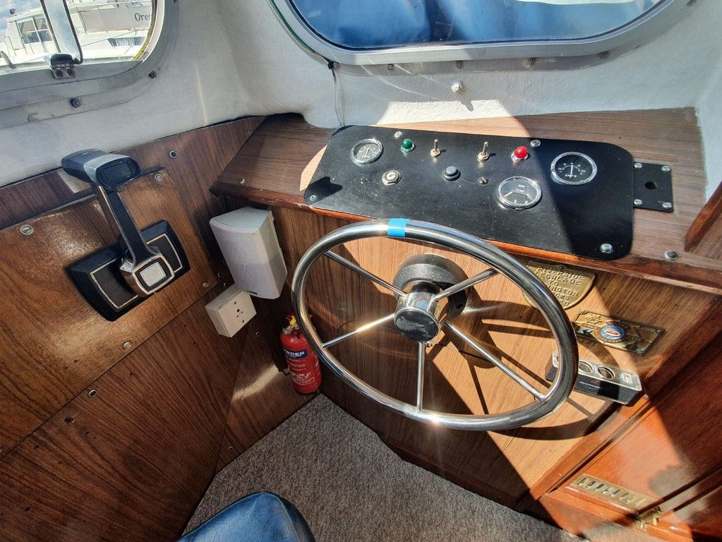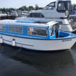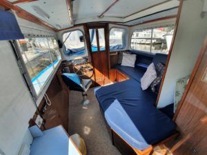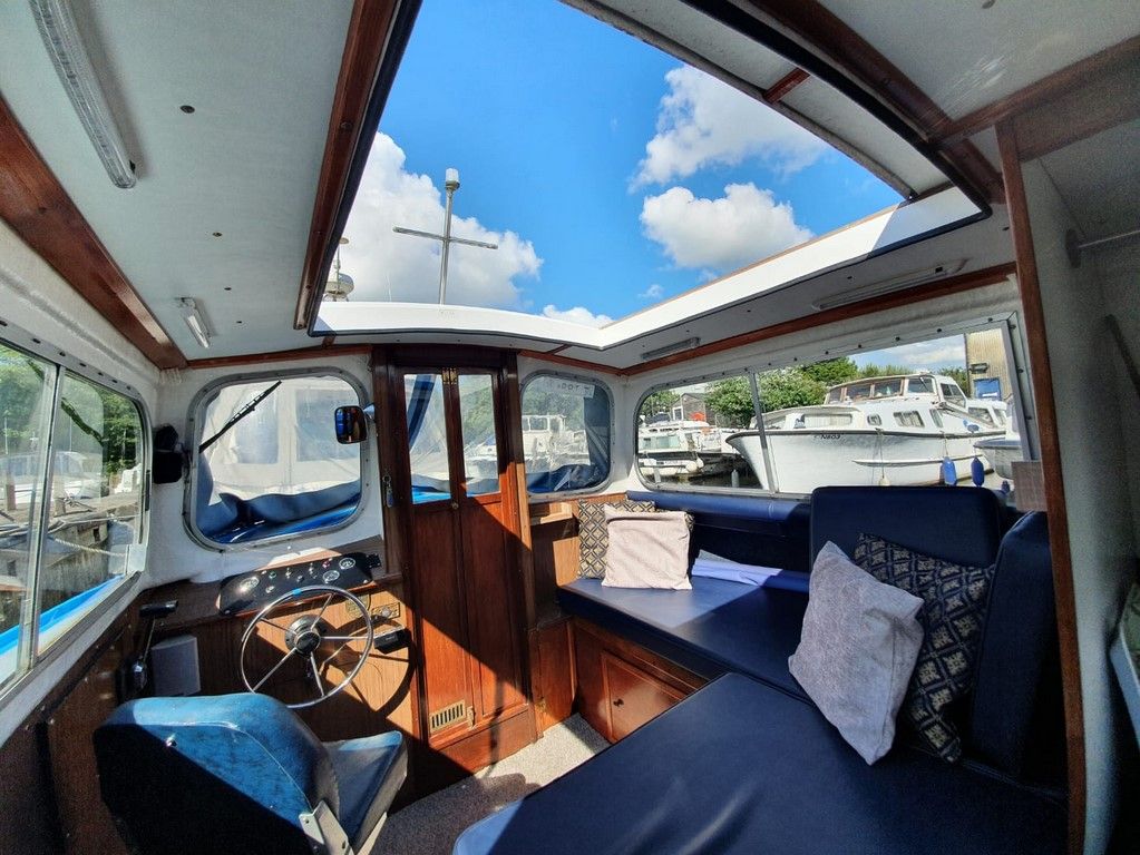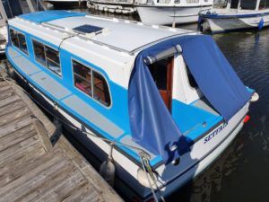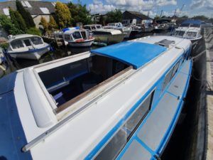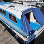 HAMPTON SAFARI 25 – Circa 1980 – Powered by a single BMC diesel through a shaft. 4 berth accommodation with toilet and shower. Specification to include; Propex warm air heating, holding tank, 600w inverter, shore power, solar panel, hob,oven and grill. Sliding sunroof over saloon with new covers for forward and aft wells. Engine service 2019. In current ownership for 6 years cruising the Thames. A low air draft river cruiser originally built locally in Oulton Broad, ideal for those looking to explore the full extent of the Norfolk Broads!