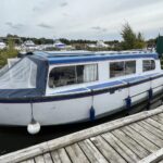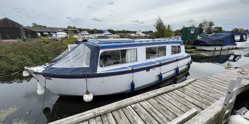 Hampton Safari MK III – Circa 1980 – Powered by a BMC 1.5 36hp diesel through a shaft. 3 berth accommodation with toilet and shower. Specification to include; Webasto warm air heating, holding tank, electric windlass, shore power, solar panel, hob, oven and grill. Waeco fridge, calorifier, sliding sunroof over saloon, A timeless, low air-draft river cruiser with forward and aft access, ideal for those looking to explore the full extent of the Norfolk Broads. NYA STOCK – Sold as traded in