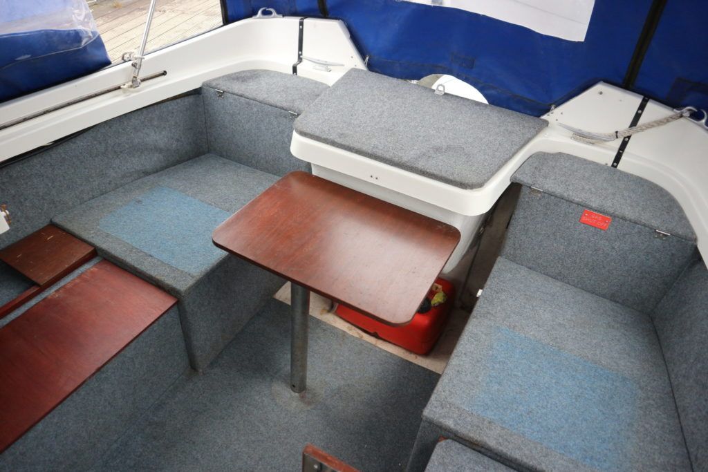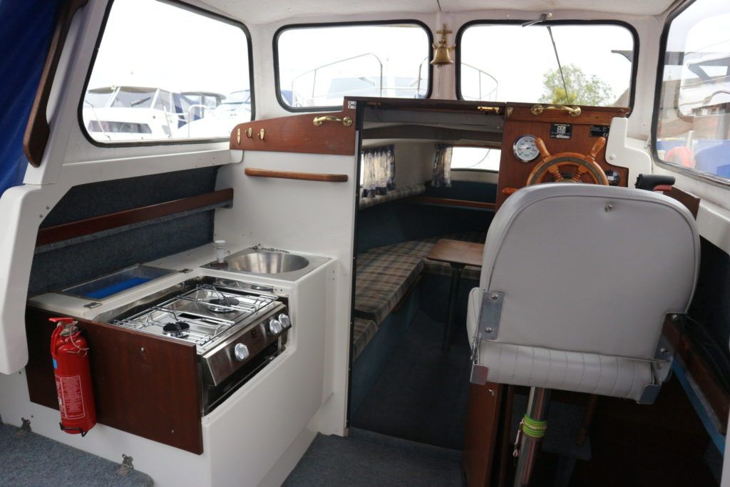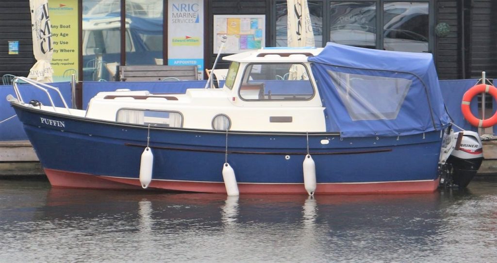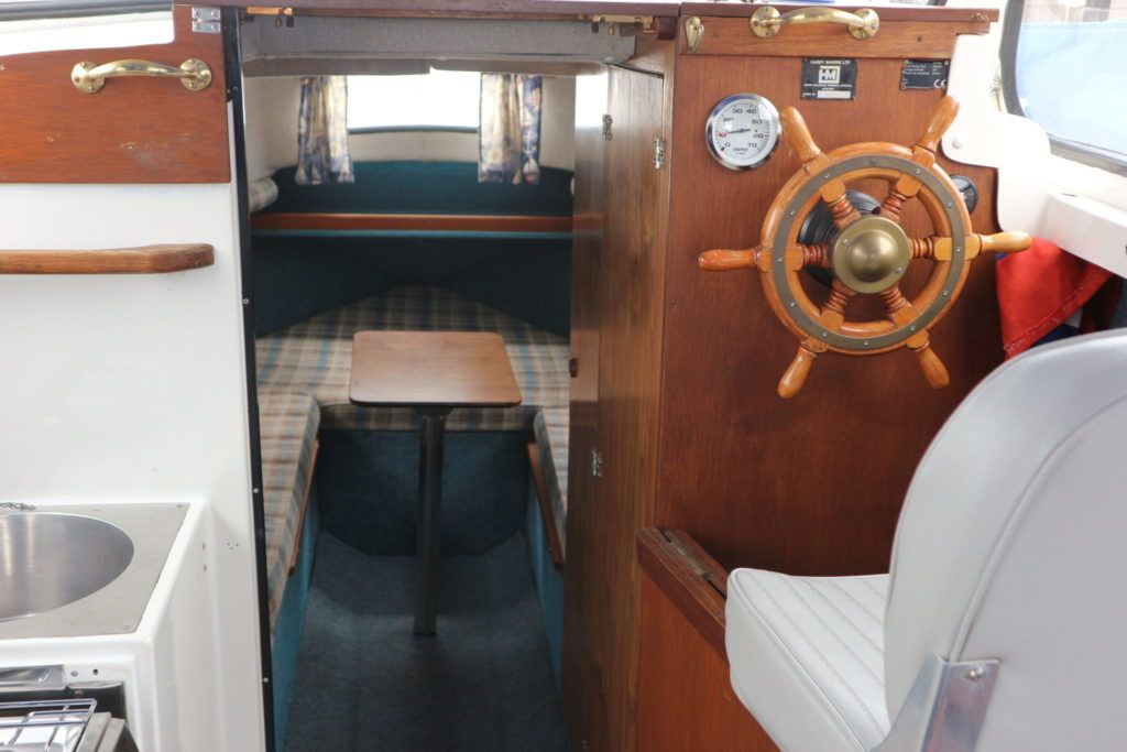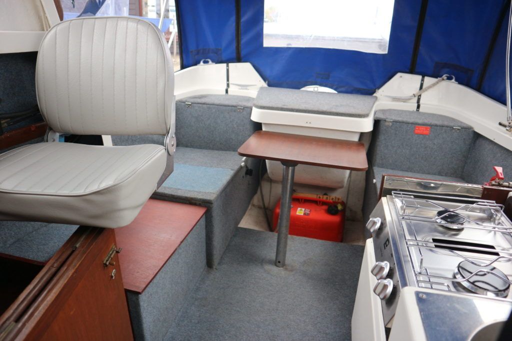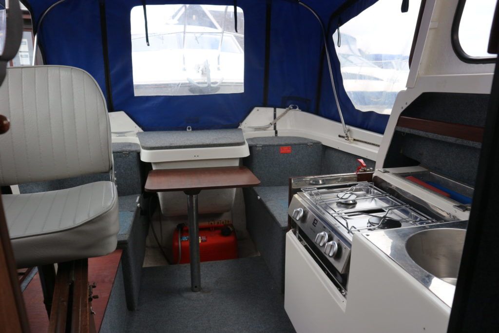HARDY 20 PILOT – 1984 circa – Mariner 25hp outboard (2008). 3 berths, two burner with grill, sink with cold water, toilet compartment, GRP semi enclosed wheelhouse, canopy, auxilary outboard bracket, BSC 2021. Antifouled and outboard serviced 2018. NYA STOCK – 3 month engine and gearbox warranty.