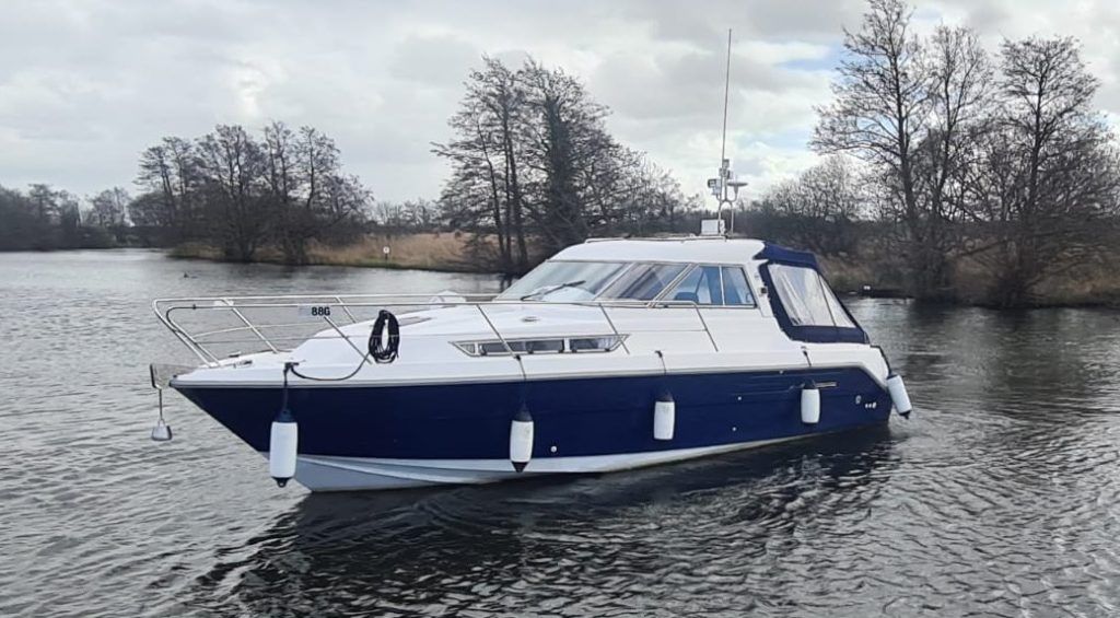 HARDY SEAWINGS / BARNES ROYALE 305 – 2002 – Single Mercruiser 250HP Diesel engine. 4 berths with 1 toilet to holding tank and 1 shower. Vetus Bow thruster, Radar, GPS, Bidata, Generator, Mikuni heating system, Hydraulic steering. A boat built for a fastidious owner, she is an extremely well cared for family cruiser. BSC until 29th March 2027, Polished and antifouled 2022, engine & outdrive serviced including bellows 2022 . Bespoke build boat with sought after single engine configuration. Her great looks are only equalled by her decent specification.