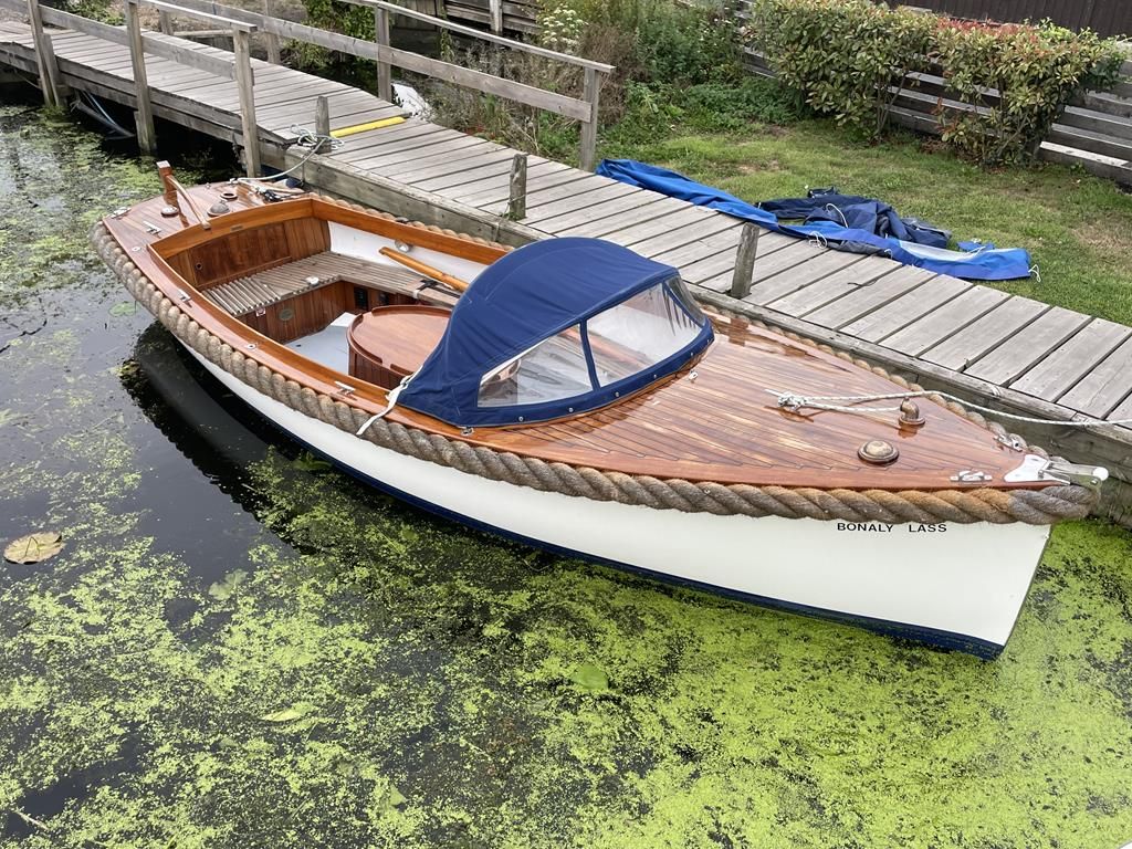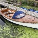 Harriet Class Launch – Circa 2000. Powered by a single Beta 20hp diesel engine through a shaft. GRP hull with a beautiful timber superstructure finish. 12v cabin lights, engine instrumentation, fuel tank, oars. Canvas cover, and folding grapnell anchor. Removable mast. Beautiful day launch ideal for Summer days on the inland waterways. Fully prepared by NYA Service Centre