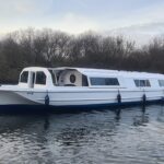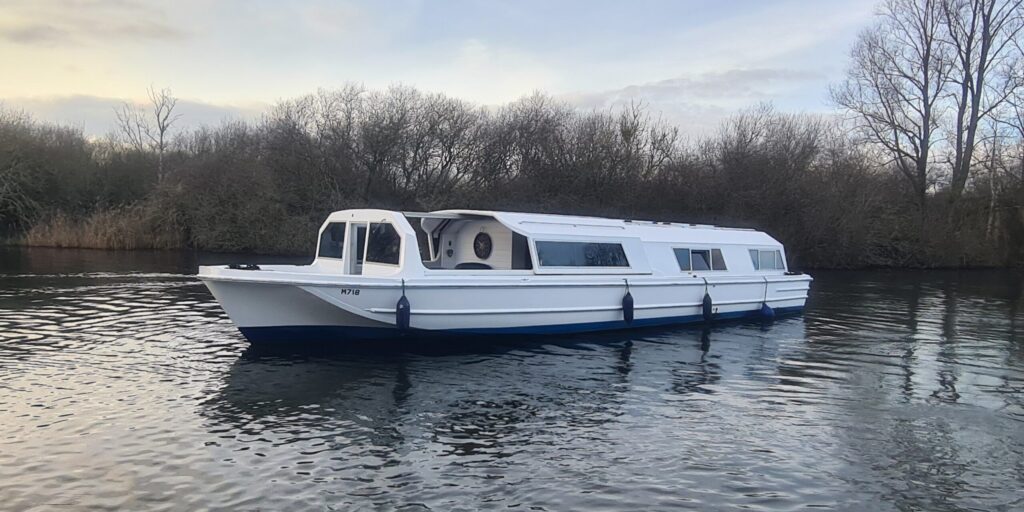 Horizon 42 – circa 1980 – Single 45hp BMC 1.8 diesel engine on a shaft, 8 berth accommodation with 2 electric flush toilets and shower compartments. Bow thruster, warm air heating, inverter, battery charger, bow thruster, recently repainted. “Idling May” has been very well looked after and tastefully upgraded. With a low air-draft allowing easy access under most Broads Bridges, and two large double cabins plus a spacious saloon she’d make an ideal live-aboard boat or very comfortable family cruiser. Viewing highly recommended.