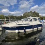 ISIS 920 – 2007 – Powered by a single Volvo D3 190hp diesel through a shaft – 6 berth accommodation with toilet and shower – large specification to include; Bowthruster, generator, electric windlass, holding tank, trim blades, warm air heating, shore power supply with 240v sockets, Garmin GPS, VHF, immersion and more! Synthetic teak laid cockpit and bathing platform and striking blue banded hull. Sought after single diesel economy with shaft configuration! A well specified, versatile cruiser presented in good order throughout….