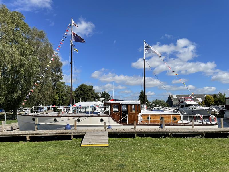 J S Thornycroft Ltd Motor Yacht – 1934 – Powered by 1 x Perkins 6354 & 2 x Perkins 4107 diesel engines through shaft. Offering up to 5 berth accommodation over two cabins and saloon with two toilet compartments, one with shower. Galley with twin hob, microwave, fridge and sink. Specification including shore power, 2 battery chargers, immersion heater, Raymarine chart plotter, VHF, echo sounder. A charming vessel steeped in documented history, lovingly restored and maintained by her current owners.