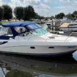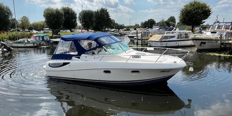 Jeanneau Leader 805 – 2004 – Powered by a Volvo KAD43P-DP 230hp diesel engine. 4 berth accommodation with a toilet and shower compartment. Optional 2 in the cockpit. Specification to include; Bow thruster, warm air heating, holding tank, chart plotter, fishfinder, shore power, battery charger, immersion, 12v mood lighting with touch panel and more. Engine serviced 2024. A clean and tidy example of these highly sought-after diesel sports cruisers, featuring an unrivalled cockpit layout for a boat of its size and with only 455 hours on the clock!