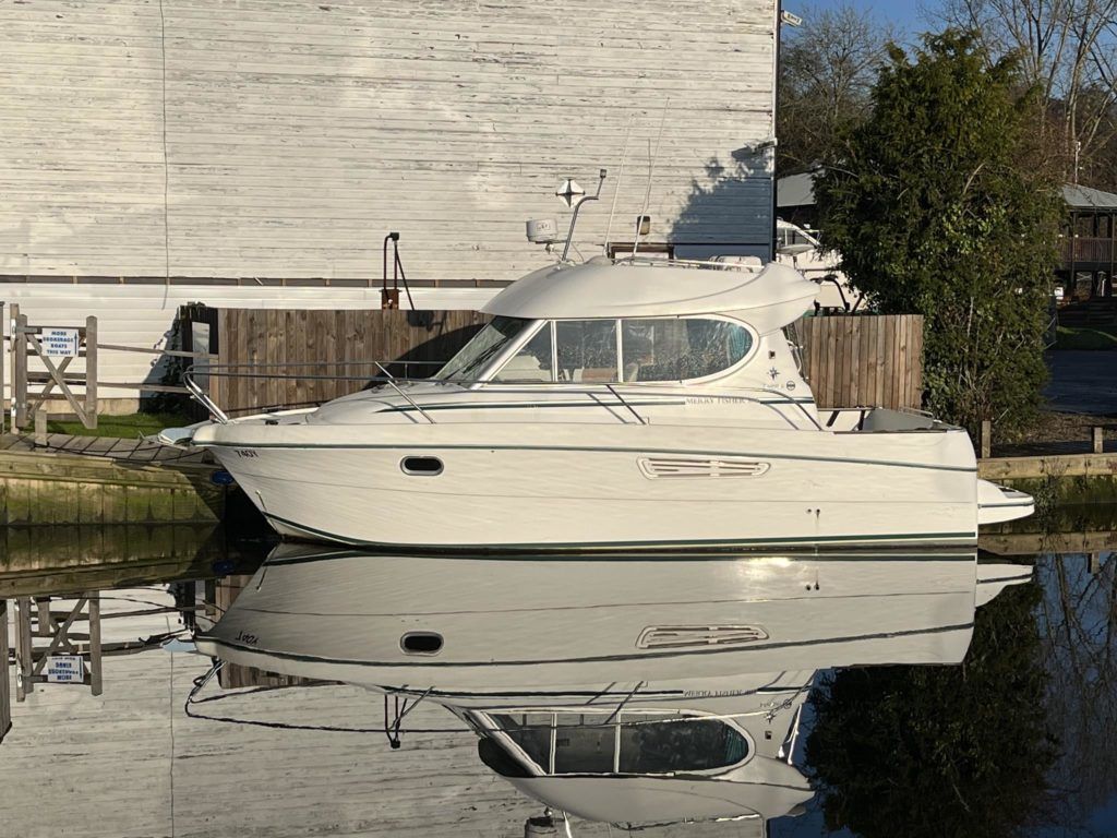 Jeanneau Merry Fisher 805 – 2005 – Powered by a Volvo TAMD41P 200hp diesel engine through shaft. Up to 4 berth accommodation with 1 x toilet to holding tank and shower. Galley with 2 burner hob, sink & fridge. A generous spec including bow thruster, warm air heating, electric windlass, shore power, battery charger, immersion, reversing camera, VHF, AIS, Auto pilot, Radar, Chart plotter and more! BSC 08/24. Large cockpit with Lazarette, additional lighting and rod holders fitted making this the ideal sea fisher or a great introduction into offshore or inland boating. Presented in very good condition throughout.