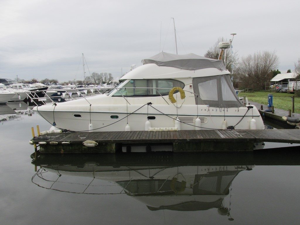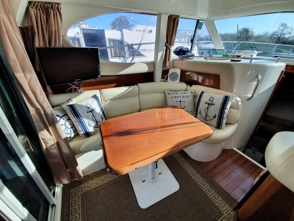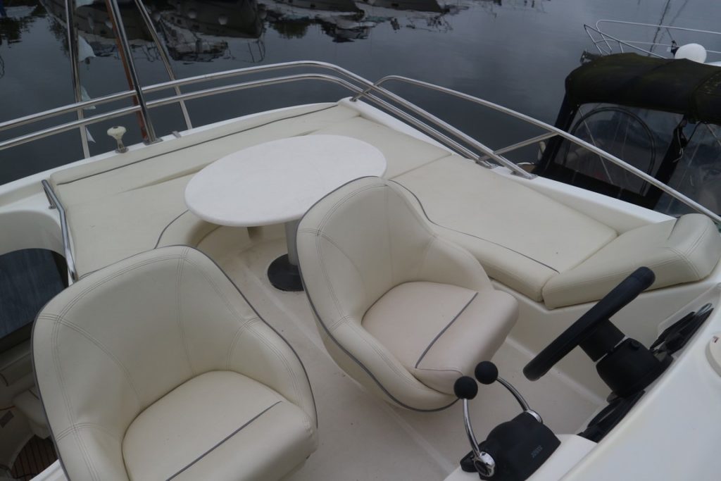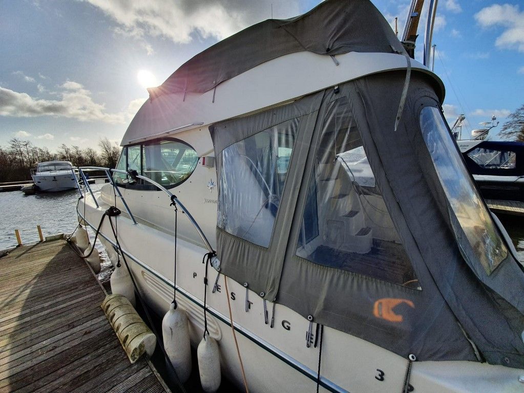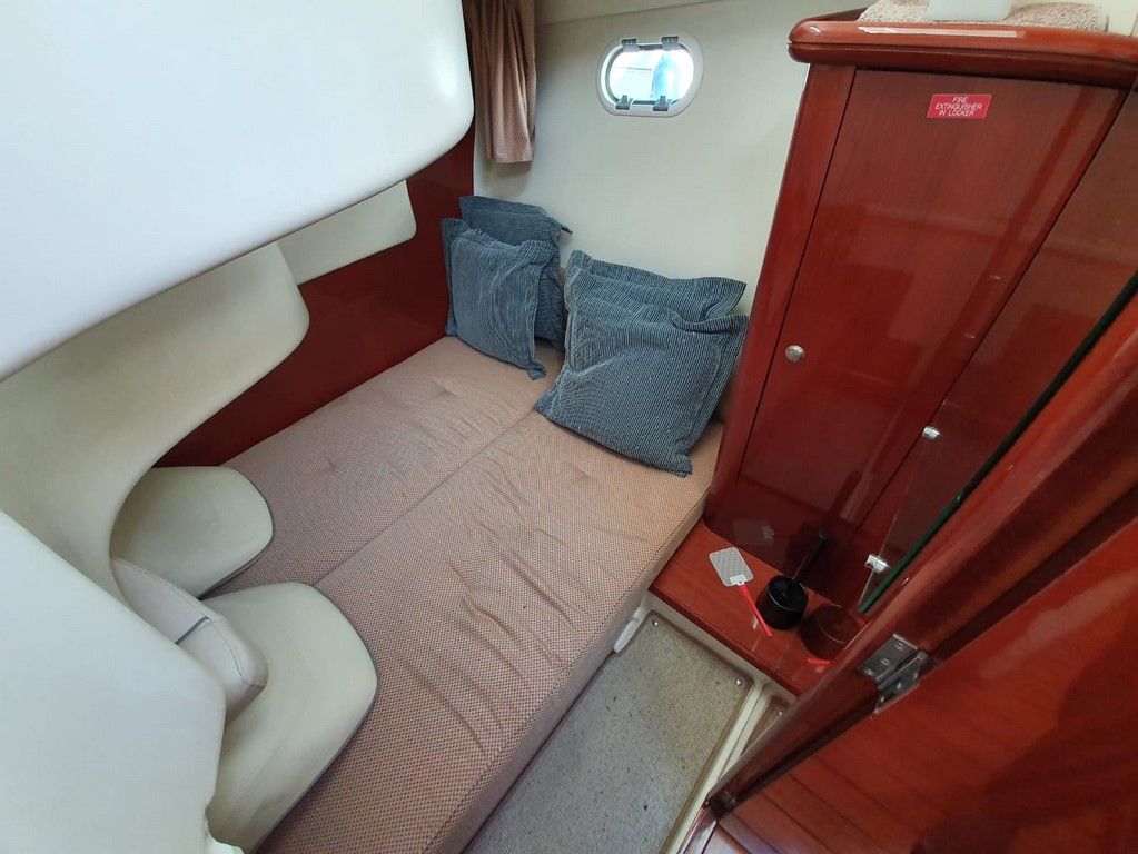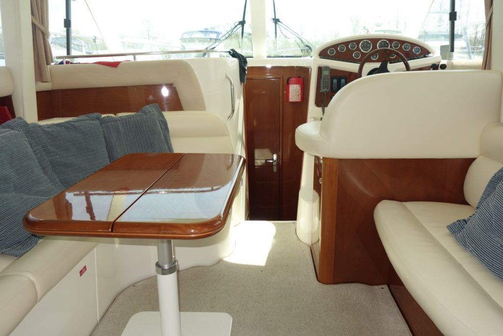 JEANNEAU PRESTIGE 32 – 2003 – Twin Volvo Penta KAMD300 285HP Diesel Engines. 6 berths including a large island double berth with 1 toilet to holding tank and 1 shower. Specification to include; Bow and stern thruster with remote, Warm air heating system, Trim tabs, Battery charger, Shore power, Raymarine chart plotter, Autopilot, leather upholstery. The Prestige 32 is a great introduction into offshore cruising! A compact and versatile cruiser.