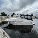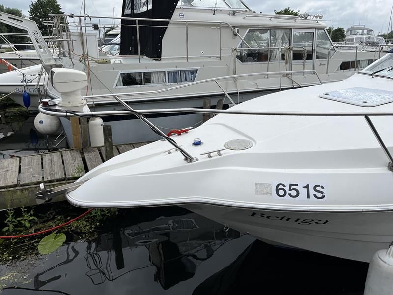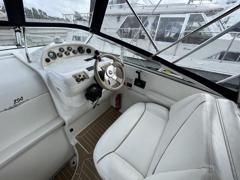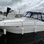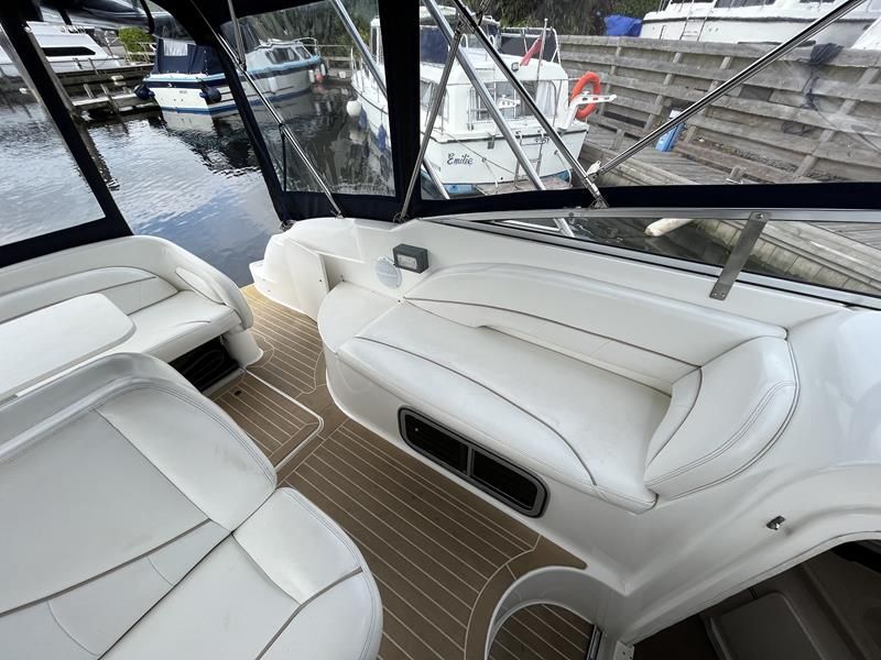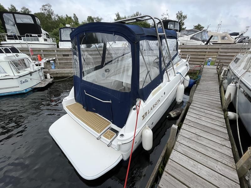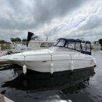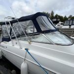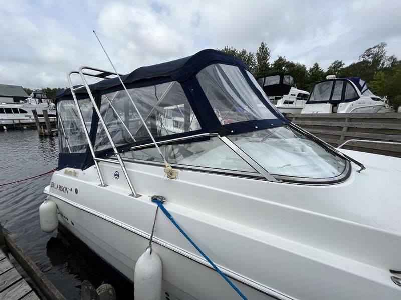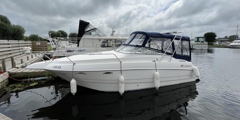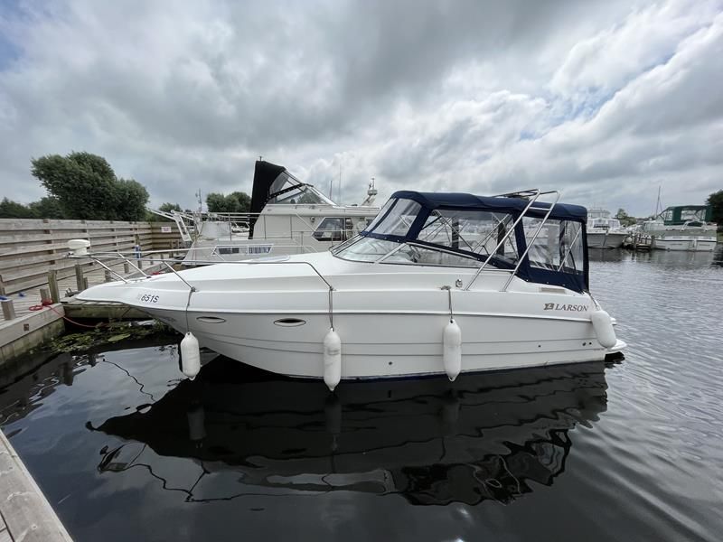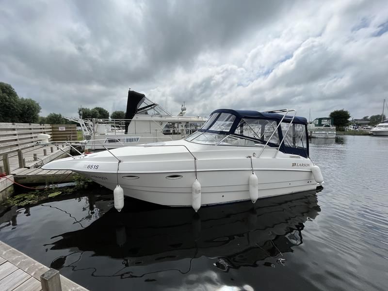 Larson 254 Cabrio – 2000 – Powered by a single Volvo KAD32 170hp Diesel engine. Up to 6 berth accommodation in cabin and occasional cockpit berth. Specification including shore power, battery charger, immersion, warm air heating, synthetic teak decking to cockpit, full folding canopy and arch, holding tank, BSC 05/26. A stylish and comfortable sports cruiser with a great sociable cockpit and the benefit of a low air draft and diesel economy.